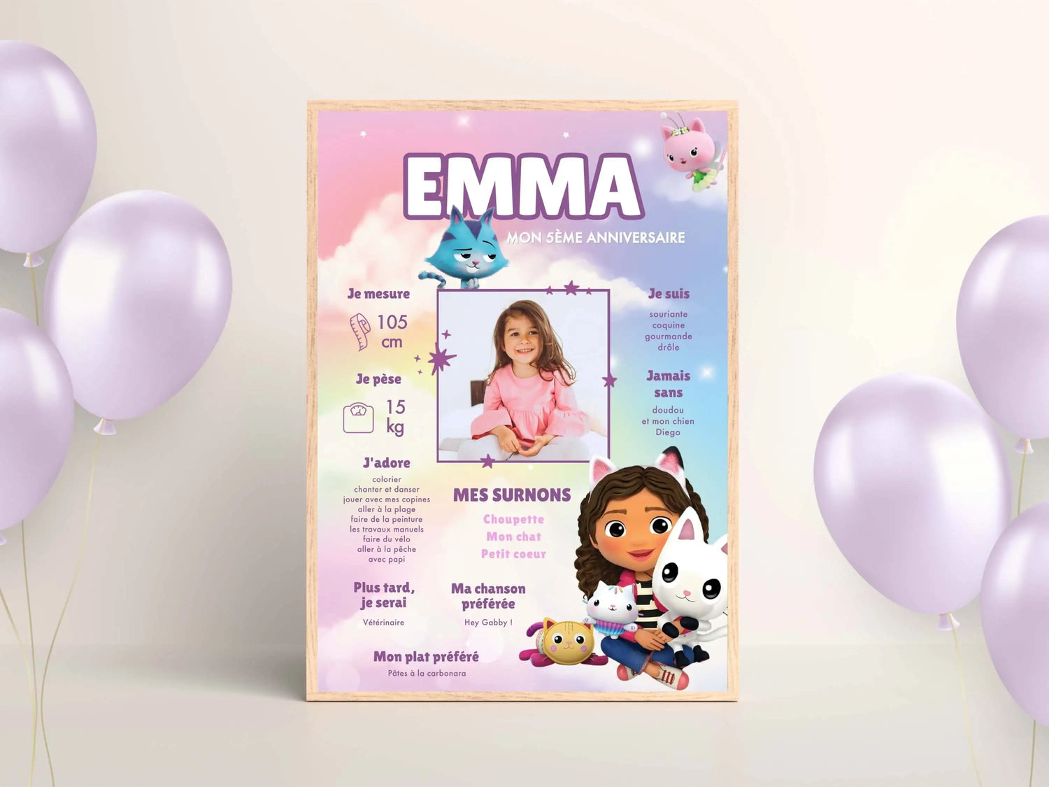 Verschönern Sie die Geburtstagsdekoration Ihres Kindes mit diesem personalisierten GABBY UND DAS MAGISCHE HAUS-Geburtstagsposter! Einfach über unser Online-Tool mit Foto, Vornamen und kleinen Details personalisieren , die es einzigartig machen. Dieses dekorative Poster wird professionell auf 200 g/m² Seidenglanzpapier gedruckt und sorgt für eine lebendige und langlebige Wiedergabe. Ein emotionales Souvenir, das zu unseren anderen personalisierten Papeterieartikeln passt und eine harmonische und unvergessliche Geburtstagsdekoration zum gleichen Thema schafft.