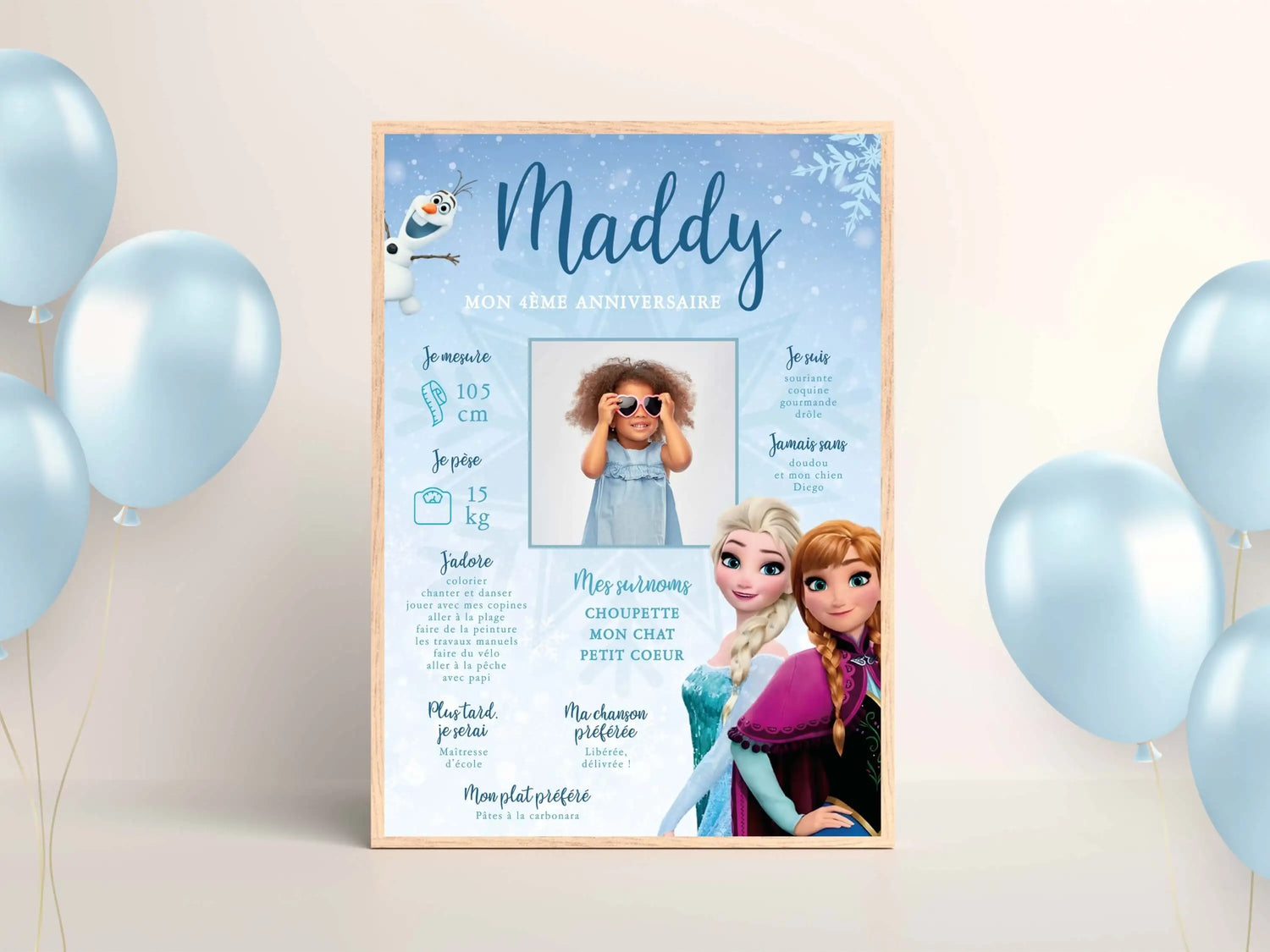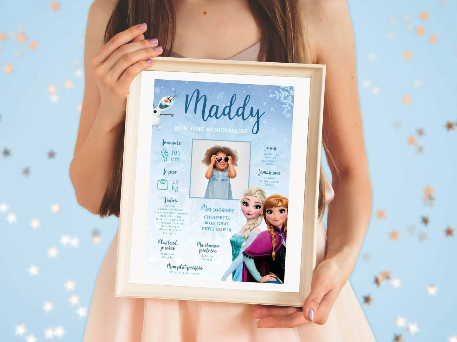 Verschönern Sie die Geburtstagsdekoration Ihres Kindes mit diesem personalisierten Frozen-Geburtstagsposter! Einfach über unser Online-Tool mit Foto, Vornamen und kleinen Details personalisieren , die es einzigartig machen. Dieses dekorative Poster wird professionell auf 200 g/m² Seidenglanzpapier gedruckt und sorgt so für eine lebendige und langlebige Wiedergabe. Ein emotionales Souvenir, das zu unseren anderen personalisierten Schreibwaren passt und eine harmonische und unvergessliche Geburtstagsdekoration zum gleichen Thema schafft.