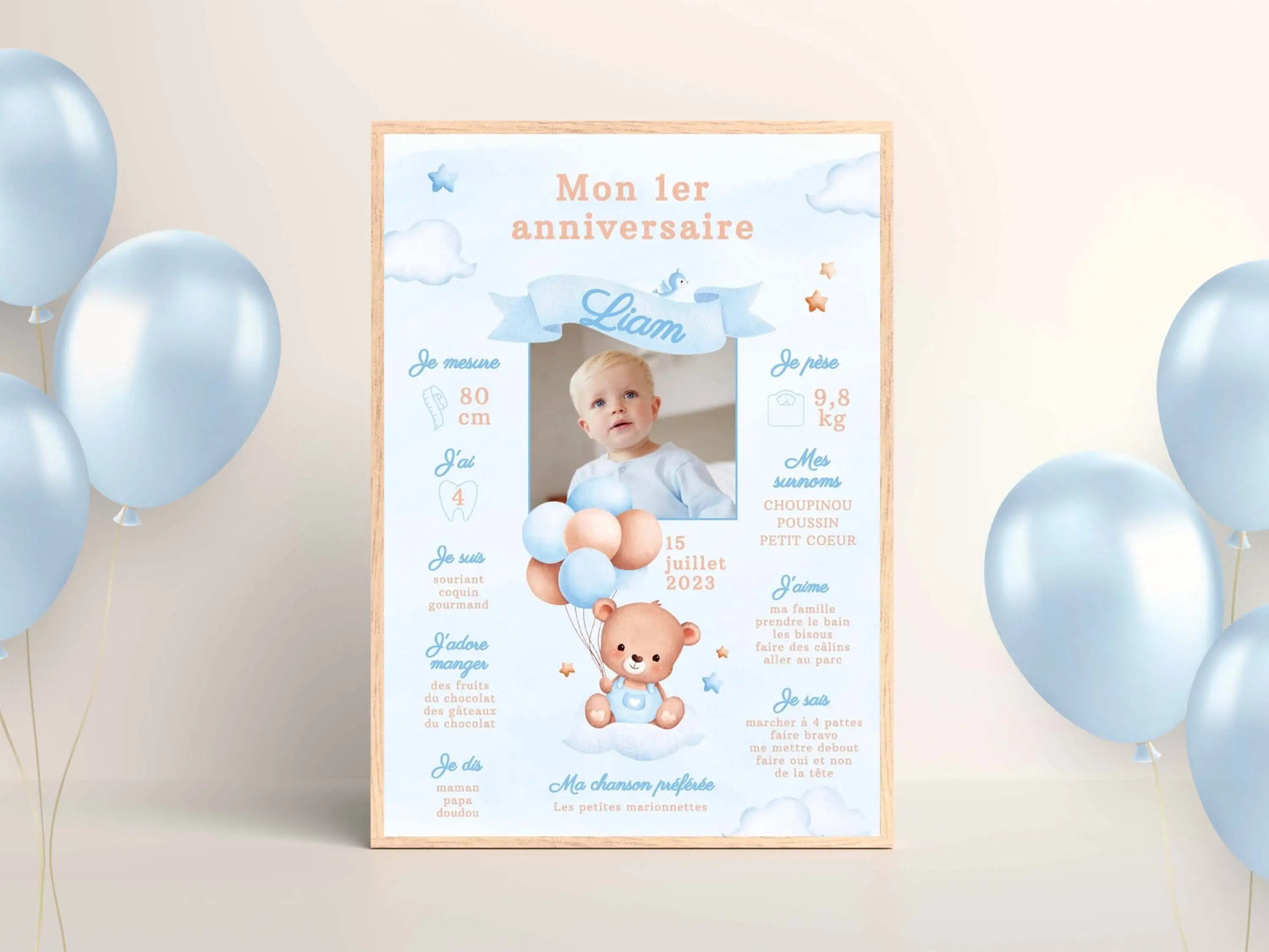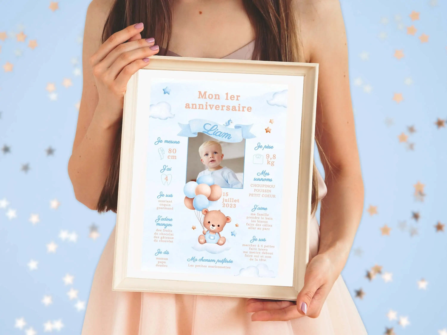 Sein Vorname, sein Alter, seine kleinen Heldentaten, seine Leidenschaften … und sogar sein Foto! Jedes Poster kann vollständig individuell angepasst werden, um die Persönlichkeit Ihres Kindes widerzuspiegeln und alles hervorzuheben, was es einzigartig macht. Ein dekoratives Element, das weit über das bloße Visuelle hinausgeht: Es ist ein wahrer Rückblick auf das vergangene Jahr, ein eingefrorener Moment, der die Herzen von Familie und Gästen berührt und den Sie Jahr für Jahr als Andenken behalten können. Wie stolz werden Sie sein, wenn Sie sein Poster zeigen, das speziell für ihn an diesem ganz besonderen Tag entworfen wurde!