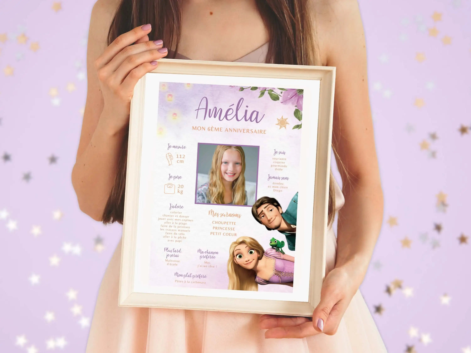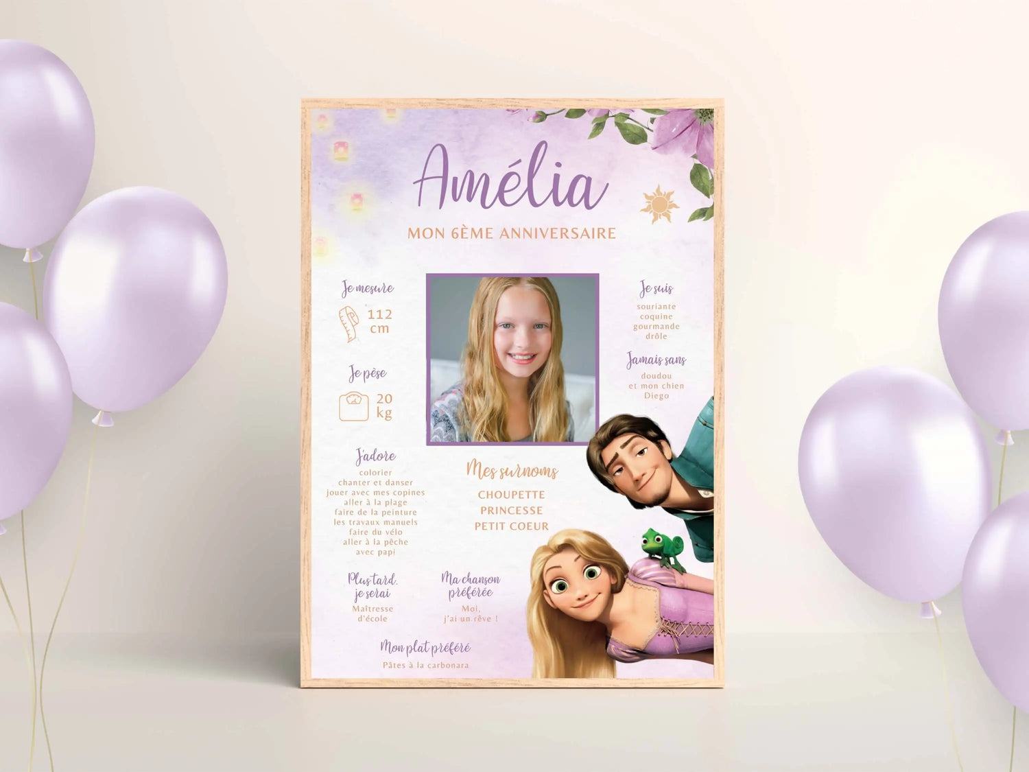 Verschönern Sie die Geburtstagsdekoration Ihres Kindes mit diesem personalisierten Rapunzel-Geburtstagsposter! Einfach über unser Online-Tool mit Foto, Vornamen und kleinen Details personalisieren , die es einzigartig machen. Dieses dekorative Poster wird professionell auf 200 g/m² Seidenglanzpapier gedruckt und sorgt so für eine lebendige und langlebige Wiedergabe. Ein emotionales Souvenir, das zu unseren anderen personalisierten Papeterieartikeln passt und eine harmonische und unvergessliche Geburtstagsdekoration zum gleichen Thema schafft.