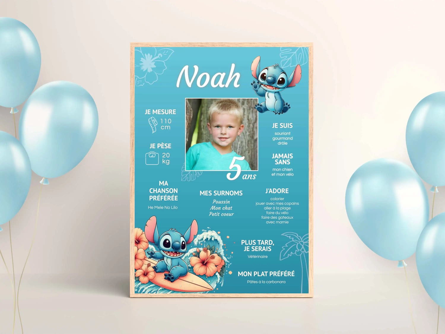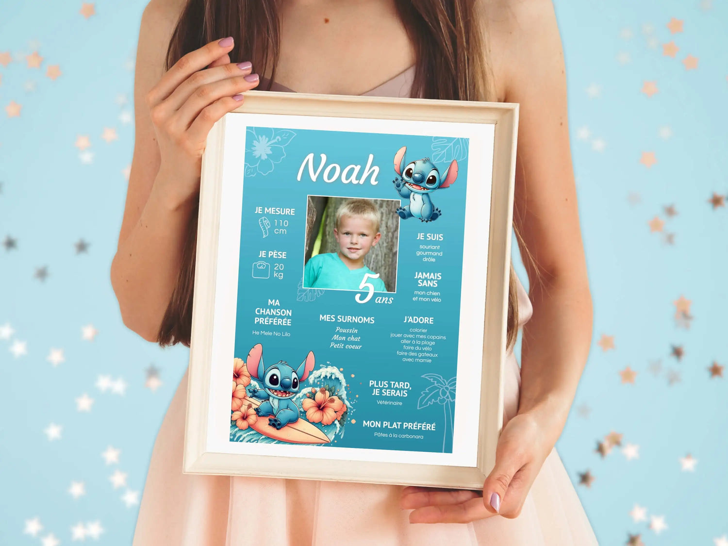 Verschönern Sie die Geburtstagsdekoration Ihres Kindes mit diesem personalisierten STITCH-Geburtstagsposter! Einfach über unser Online-Tool mit Foto, Vornamen und kleinen Details personalisieren , die es einzigartig machen. Dieses dekorative Poster wird professionell auf 200 g/m² Seidenglanzpapier gedruckt und sorgt so für eine lebendige und langlebige Wiedergabe. Ein emotionales Souvenir, das zu unseren anderen personalisierten Papeterieartikeln passt und eine harmonische und unvergessliche Geburtstagsdekoration zum gleichen Thema schafft.