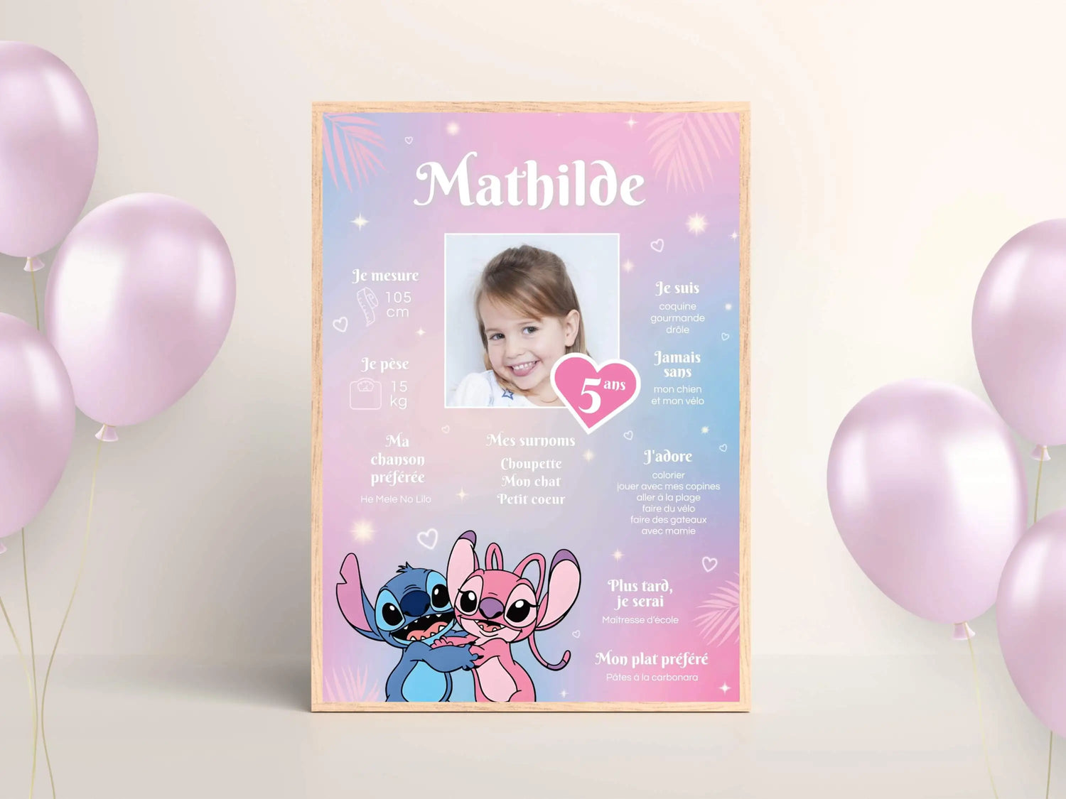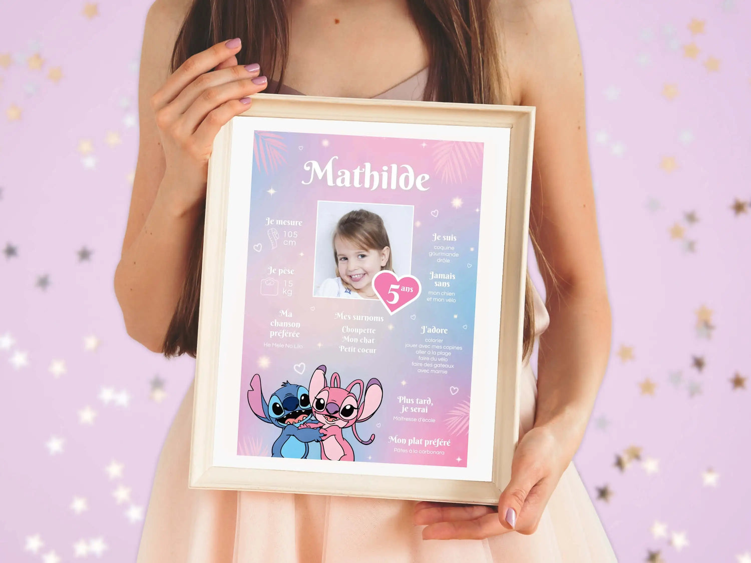 Verschönern Sie die Geburtstagsdekoration Ihres Kindes mit diesem personalisierten STITCH & ANGEL-Geburtstagsposter! Einfach über unser Online-Tool mit Foto, Vornamen und kleinen Details personalisieren , die es einzigartig machen. Dieses dekorative Poster wird professionell auf 200 g/m² Seidenglanzpapier gedruckt und sorgt so für eine lebendige und langlebige Wiedergabe. Ein emotionales Souvenir, das zu unseren anderen personalisierten Papeterieartikeln passt und eine harmonische und unvergessliche Geburtstagsdekoration zum gleichen Thema schafft.