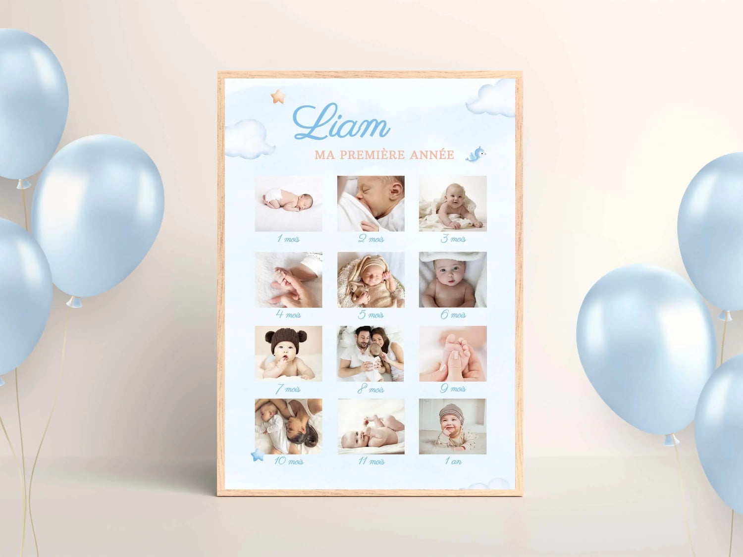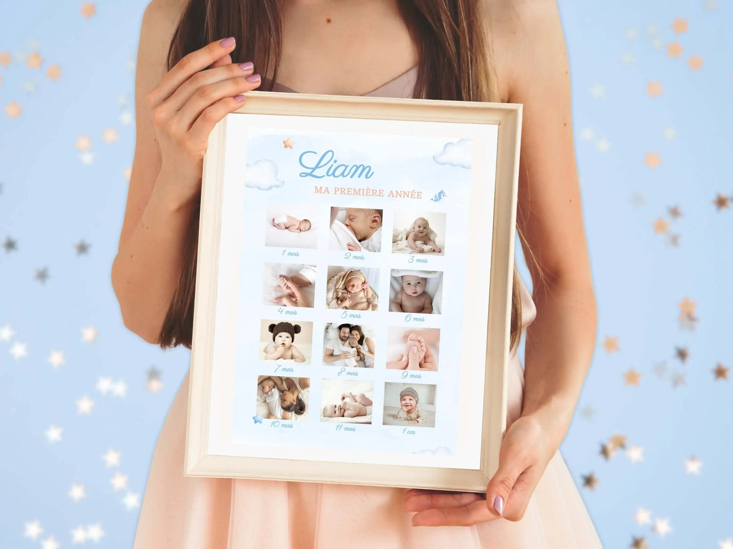Jeder Moment im ersten Jahr Ihres Kindes ist ein Schatz! Mit unserem personalisierten Poster verewigen Sie ihre schönsten Momente Monat für Monat. Sein Vorname und seine Fotos bilden eine großartige visuelle Zusammenfassung dieses magischen Jahres. Eine einmalige Erinnerung, die Sie mit jedem Blick zurück in die gemeinsamen Momente des Glücks und der Zärtlichkeit mit der Familie führt.