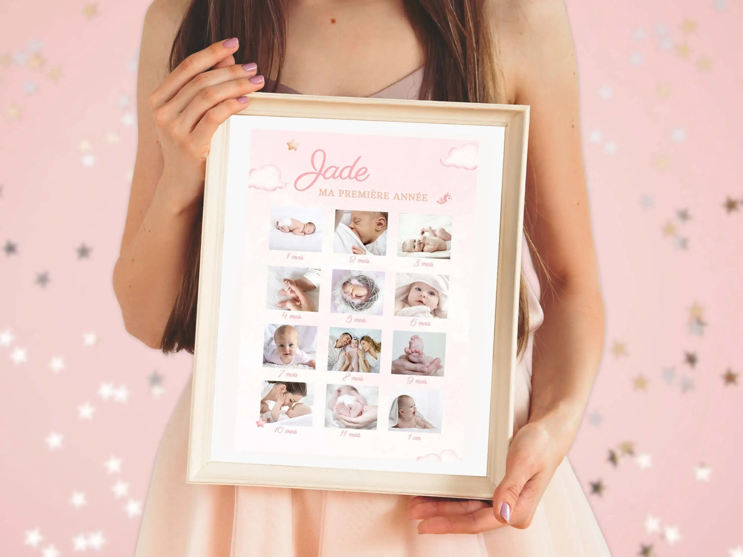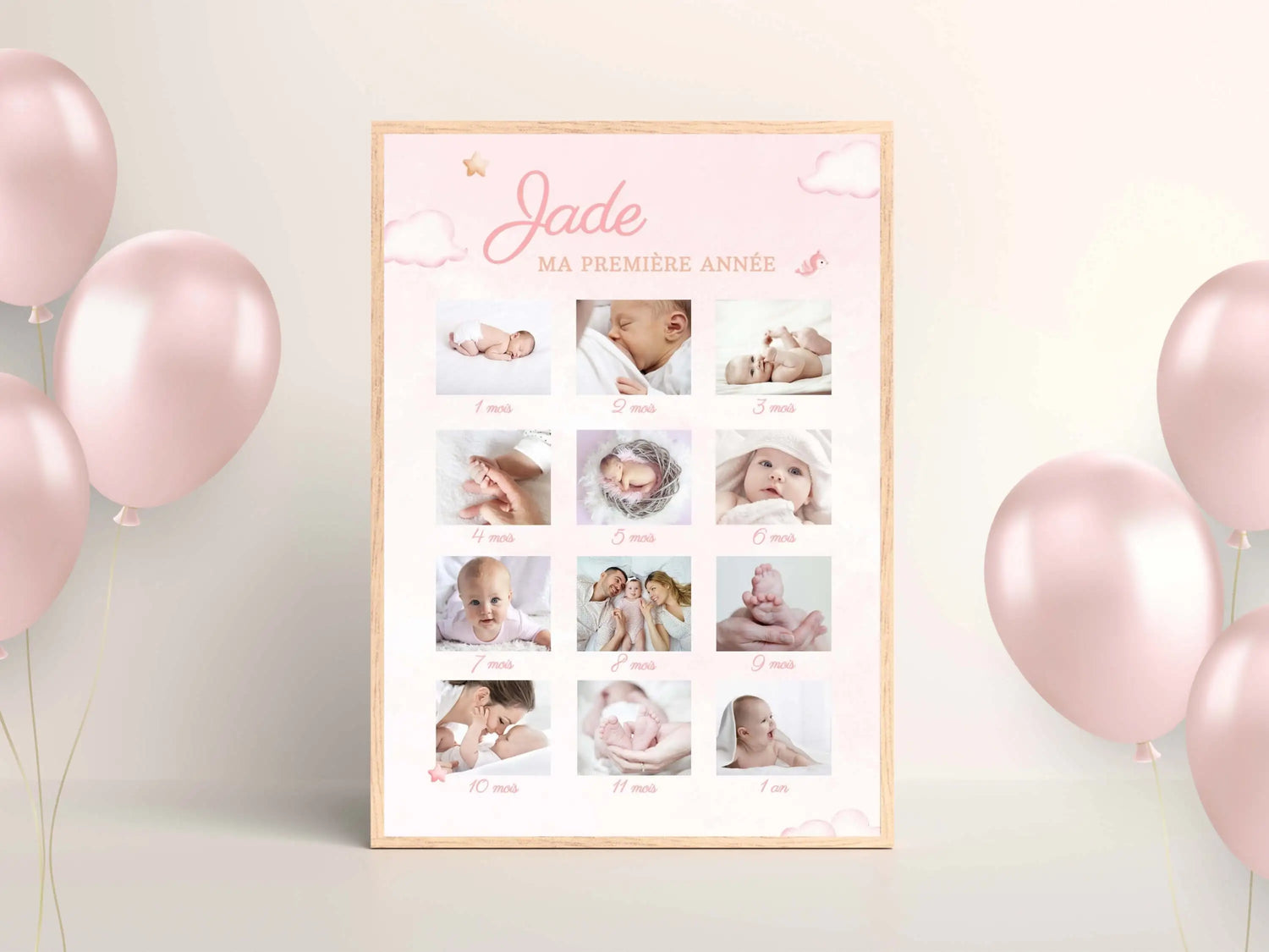 Jeder Moment im ersten Jahr Ihres Kindes ist ein Schatz! Mit unserem personalisierten Poster verewigen Sie ihre schönsten Momente Monat für Monat. Sein Vorname und seine Fotos bilden eine großartige visuelle Zusammenfassung dieses magischen Jahres. Eine einmalige Erinnerung, die Sie mit jedem Blick zurück in die gemeinsamen Momente des Glücks und der Zärtlichkeit mit der Familie führt.