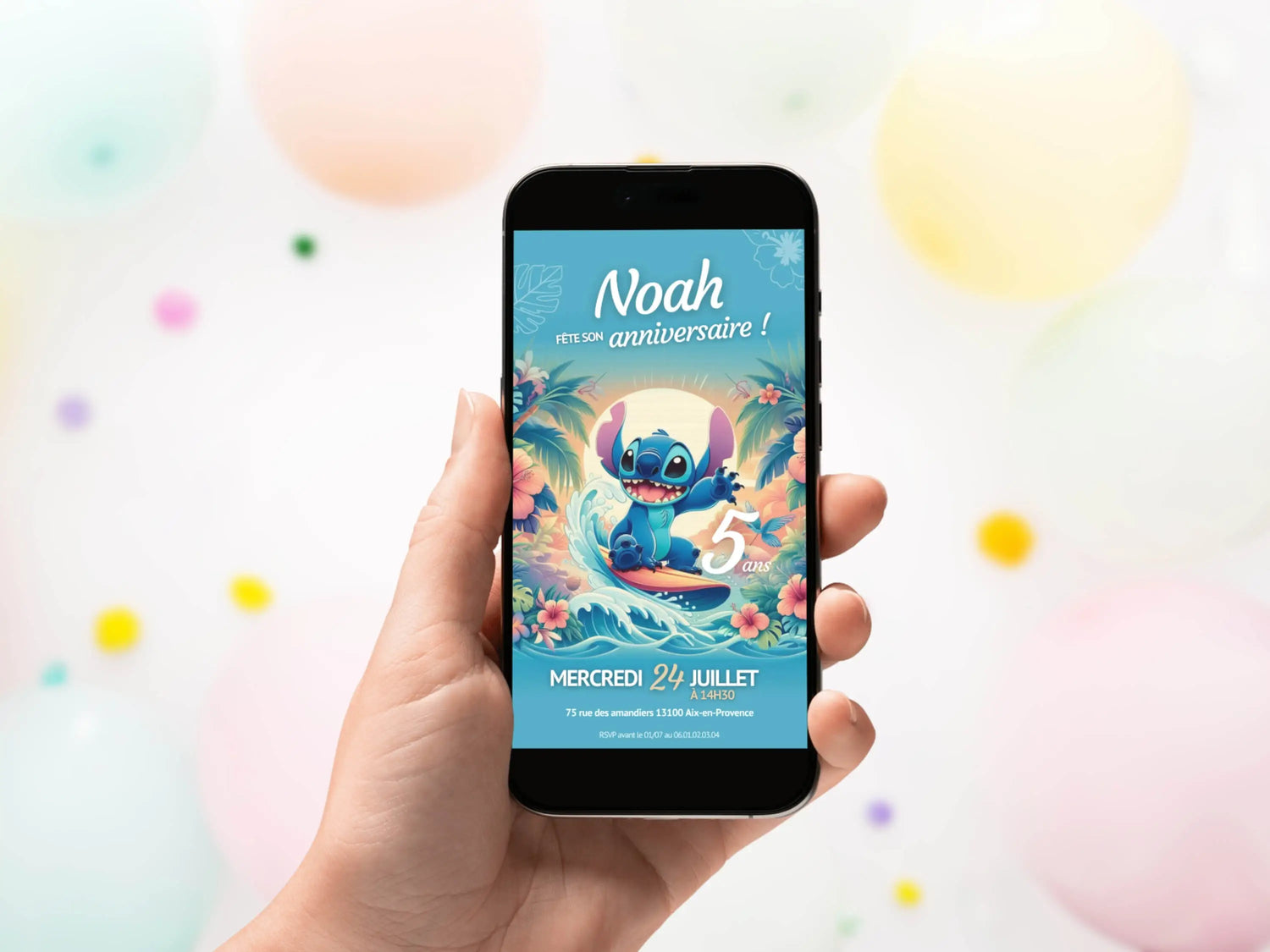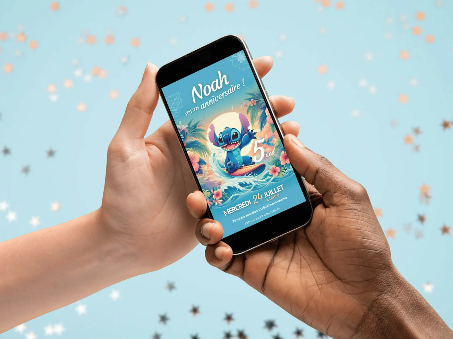 Sorgen Sie vom ersten Moment an für Aufsehen, indem Sie uns mit unserer personalisierten digitalen STITCH-Geburtstagseinladung einladen, die Sie per SMS, WhatsApp oder E-Mail versenden können . Dieses praktische, schnelle und 100 % digitale Format ist ideal für eine stressfreie Party. Personalisieren Sie Ihre mobile Einladung ganz einfach online über Canva : Vorname, Alter, Datum, Ort … alles lässt sich mit wenigen Klicks ändern, ohne Software. Nach der Validierung kann Ihre digitale Einladung heruntergeladen und an Ihre Gäste gesendet werden. Diese individuell gestaltete, hochwertige Karte ist für den Kindergeburtstag konzipiert und ermöglicht eine stilvolle Einladung ohne Druck und ist sofort verfügbar .