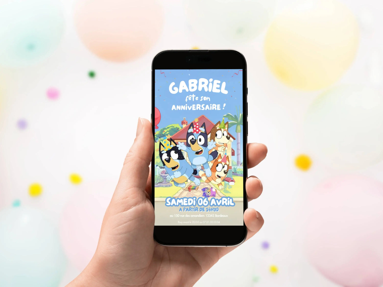 Sorgen Sie vom ersten Moment an für Aufsehen, indem Sie uns mit unserer personalisierten digitalen Geburtstagseinladung von BLUEY einladen, die Sie per Nachricht, WhatsApp oder E-Mail versenden können . Dieses praktische, schnelle und 100 % digitale Format ist ideal für eine stressfreie Party. Personalisieren Sie Ihre mobile Einladung ganz einfach online über Canva : Vorname, Alter, Datum, Ort … alles lässt sich mit wenigen Klicks ändern, ohne Software. Nach der Validierung kann Ihre digitale Einladung heruntergeladen und an Ihre Gäste gesendet werden. Diese individuell gestaltete, hochwertige Karte ist für den Kindergeburtstag konzipiert und ermöglicht eine stilvolle Einladung ohne Druck und ist sofort verfügbar .