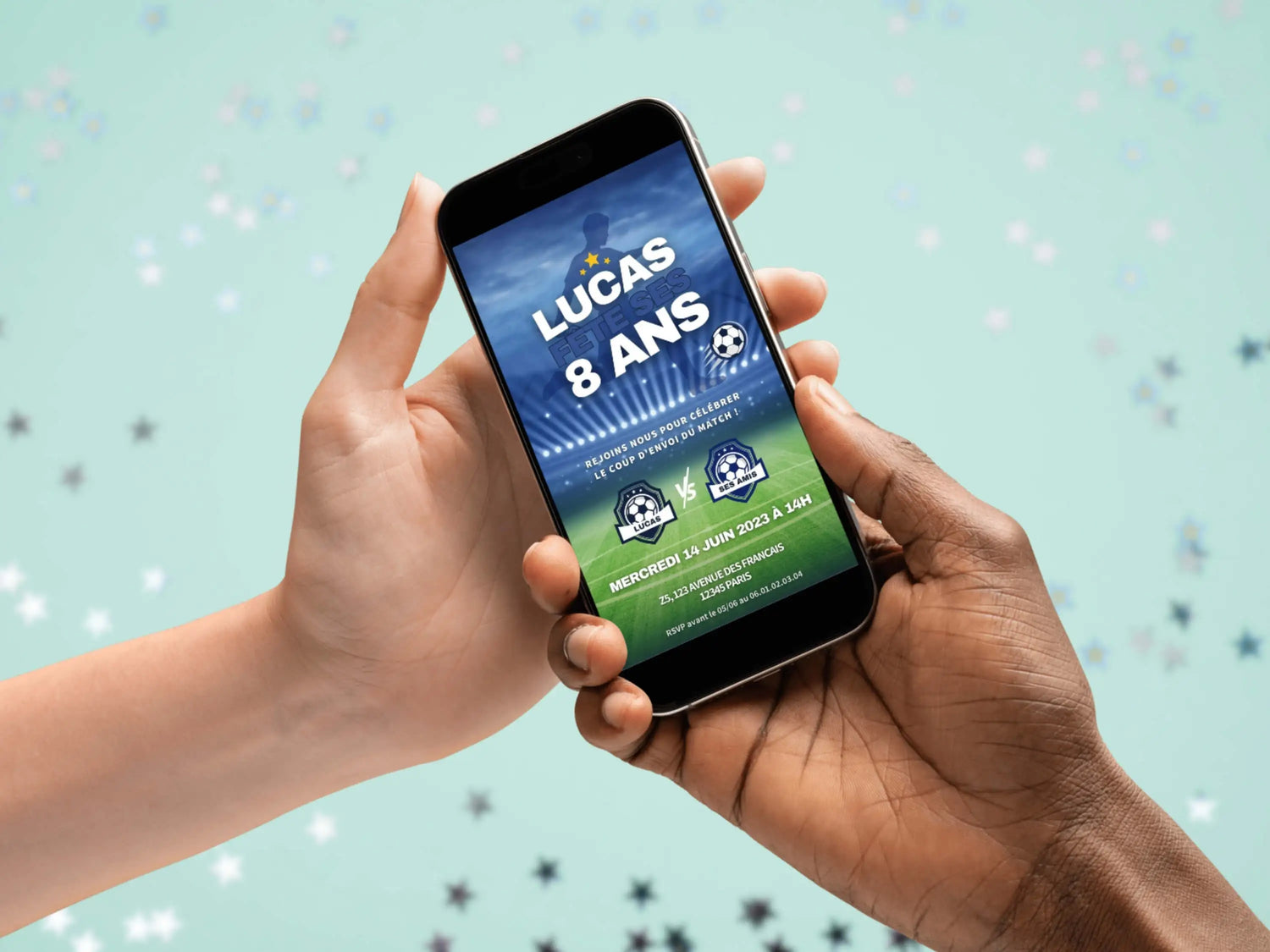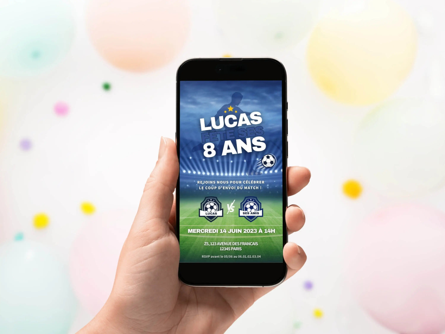 Sorgen Sie vom ersten Moment an für Aufsehen, indem Sie uns mit unserer personalisierten digitalen FUSSBALL-Geburtstagseinladung einladen, die Sie per Nachricht, WhatsApp oder E-Mail versenden können . Dieses praktische, schnelle und 100 % digitale Format ist ideal für eine stressfreie Party. Personalisieren Sie Ihre mobile Einladung ganz einfach online über Canva : Vorname, Alter, Datum, Ort … alles lässt sich mit wenigen Klicks ändern, ohne Software. Nach der Validierung kann Ihre digitale Einladung heruntergeladen und an Ihre Gäste gesendet werden. Diese individuell gestaltete, hochwertige Karte ist für den Kindergeburtstag konzipiert und ermöglicht eine stilvolle Einladung ohne Druck und ist sofort verfügbar .