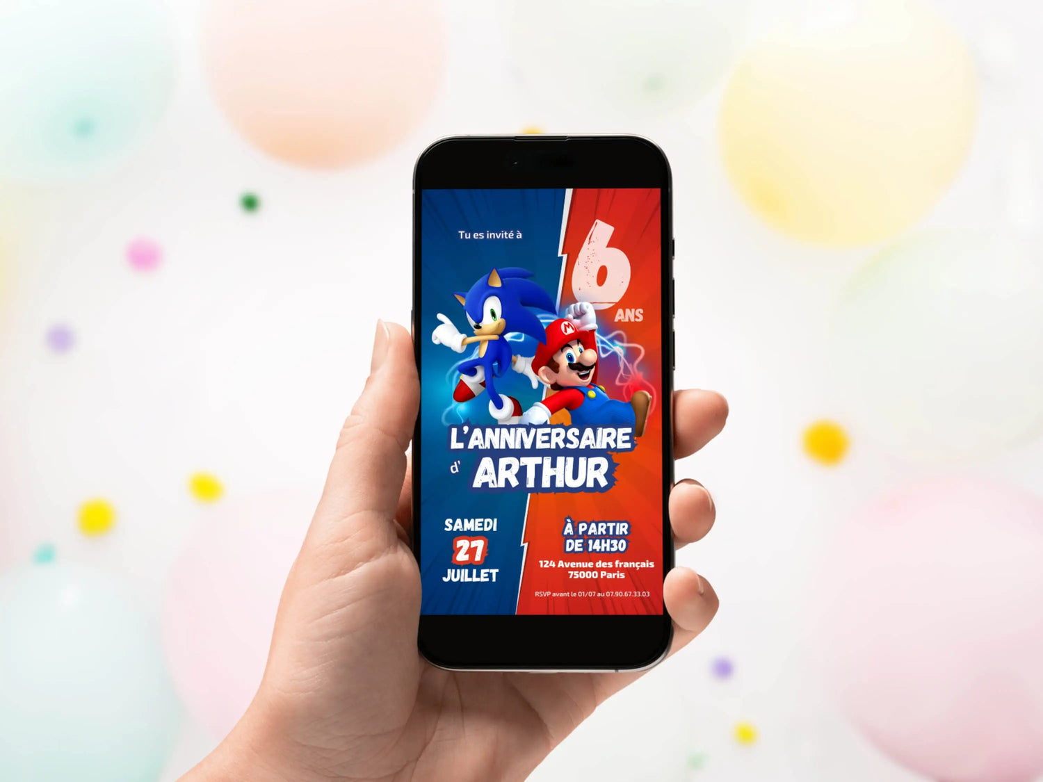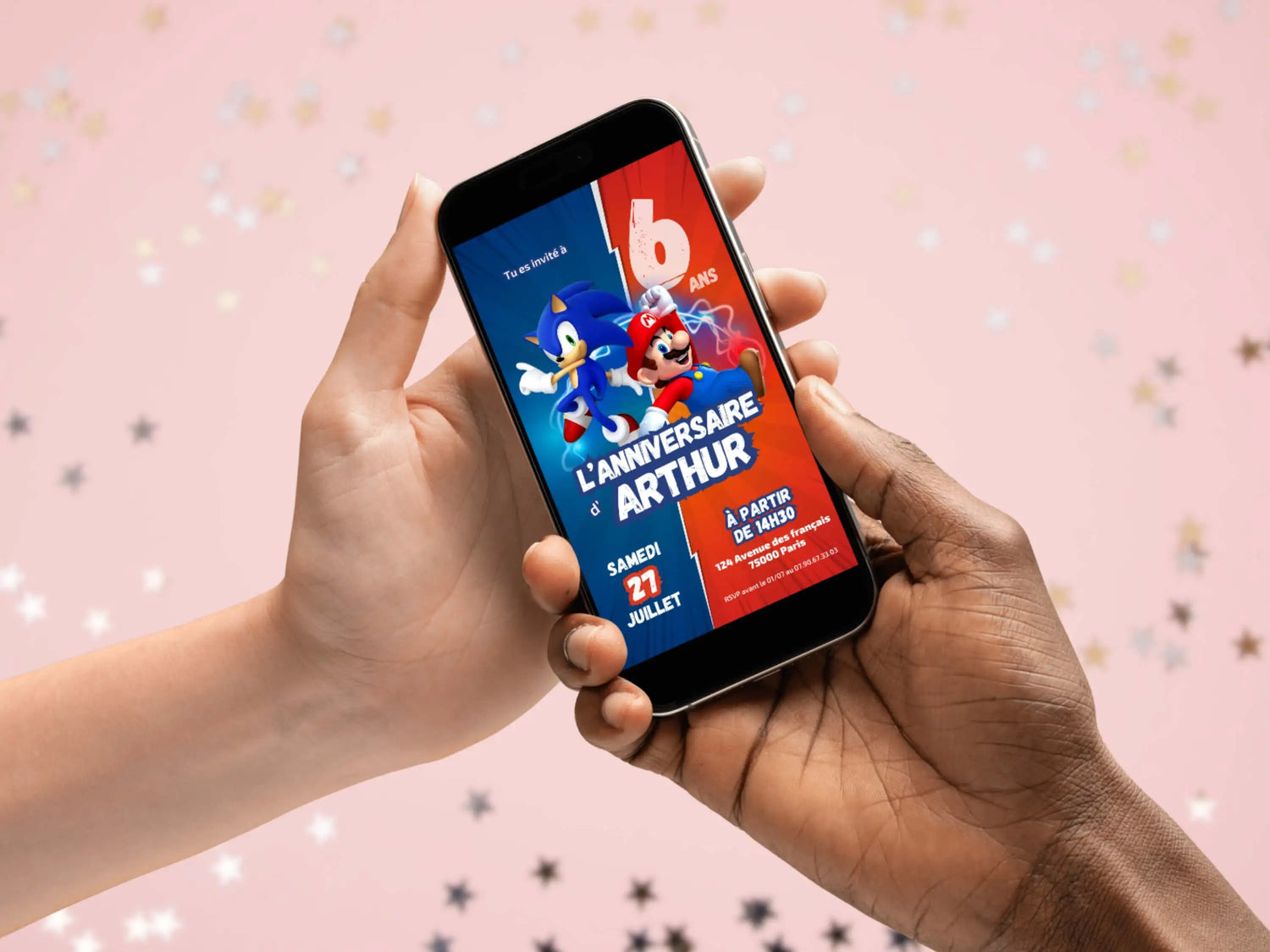 Sorgen Sie vom ersten Moment an für Aufsehen, indem Sie uns mit unserer personalisierten digitalen MARIO & SONIC-Geburtstagseinladung einladen, die Sie per Nachricht, WhatsApp oder E-Mail versenden können . Dieses praktische, schnelle und 100 % digitale Format ist ideal für eine stressfreie Party. Personalisieren Sie Ihre mobile Einladung ganz einfach online über Canva : Vorname, Alter, Datum, Ort … alles lässt sich mit wenigen Klicks ändern, ohne Software. Nach der Validierung kann Ihre digitale Einladung heruntergeladen und an Ihre Gäste gesendet werden. Diese individuell gestaltete, hochwertige Karte ist für den Kindergeburtstag konzipiert und ermöglicht eine stilvolle Einladung ohne Druck und ist sofort verfügbar .