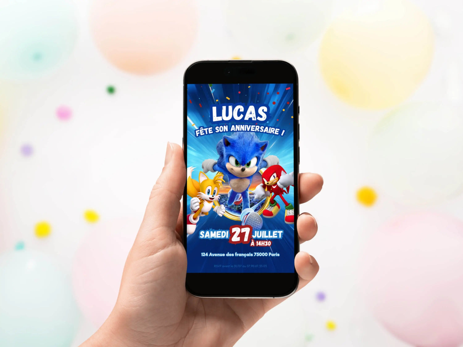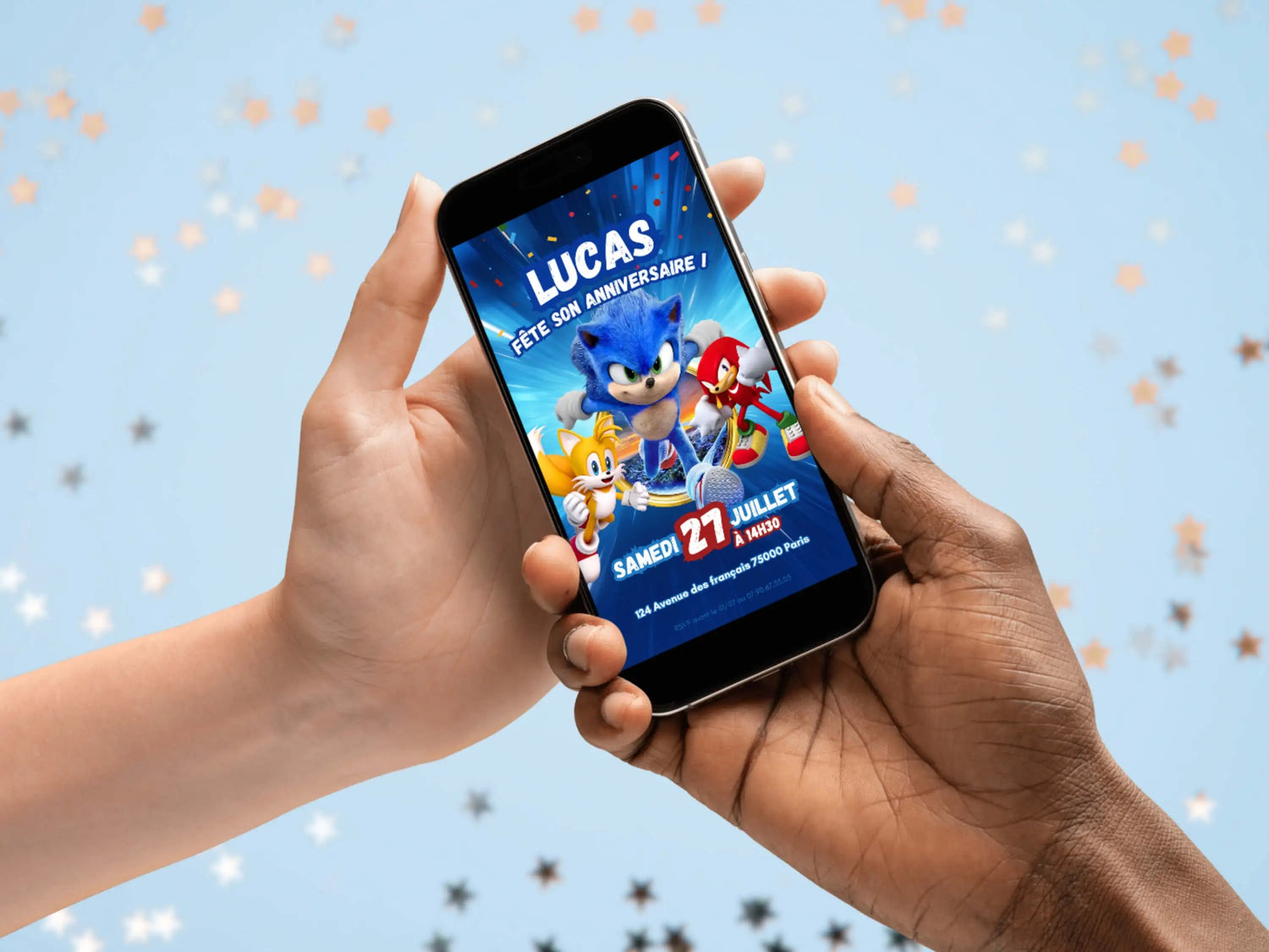 Sorgen Sie vom ersten Moment an für Aufsehen, indem Sie uns mit unserer personalisierten digitalen SONIC-Geburtstagseinladung einladen, die Sie per SMS, WhatsApp oder E-Mail versenden können . Dieses praktische, schnelle und 100 % digitale Format ist ideal für eine stressfreie Party. Personalisieren Sie Ihre mobile Einladung ganz einfach online über Canva : Vorname, Alter, Datum, Ort … alles lässt sich mit wenigen Klicks ändern, ohne Software. Nach der Validierung kann Ihre digitale Einladung heruntergeladen und an Ihre Gäste gesendet werden. Diese individuell gestaltete, hochwertige Karte ist für den Kindergeburtstag konzipiert und ermöglicht eine stilvolle Einladung ohne Druck und ist sofort verfügbar .