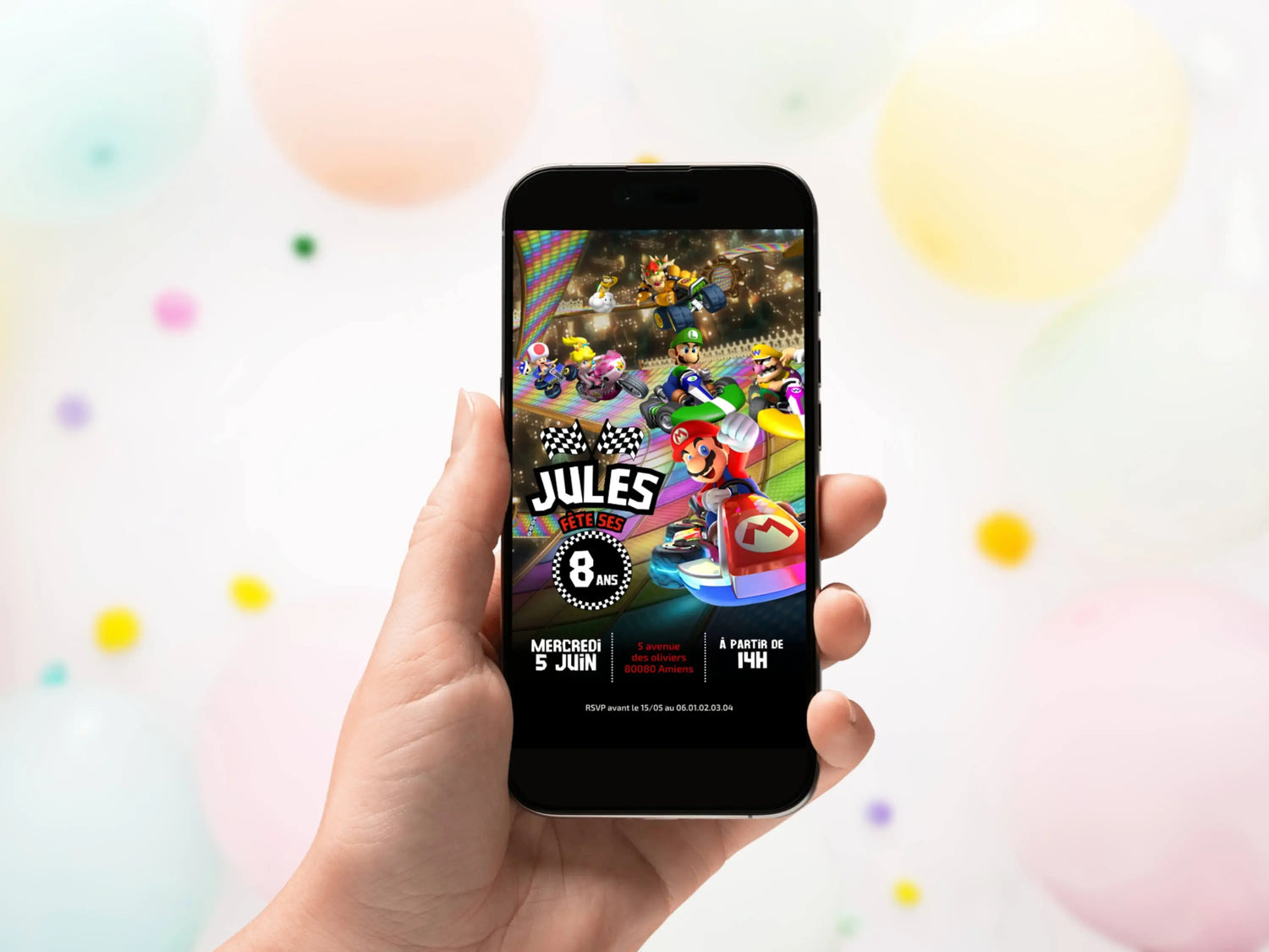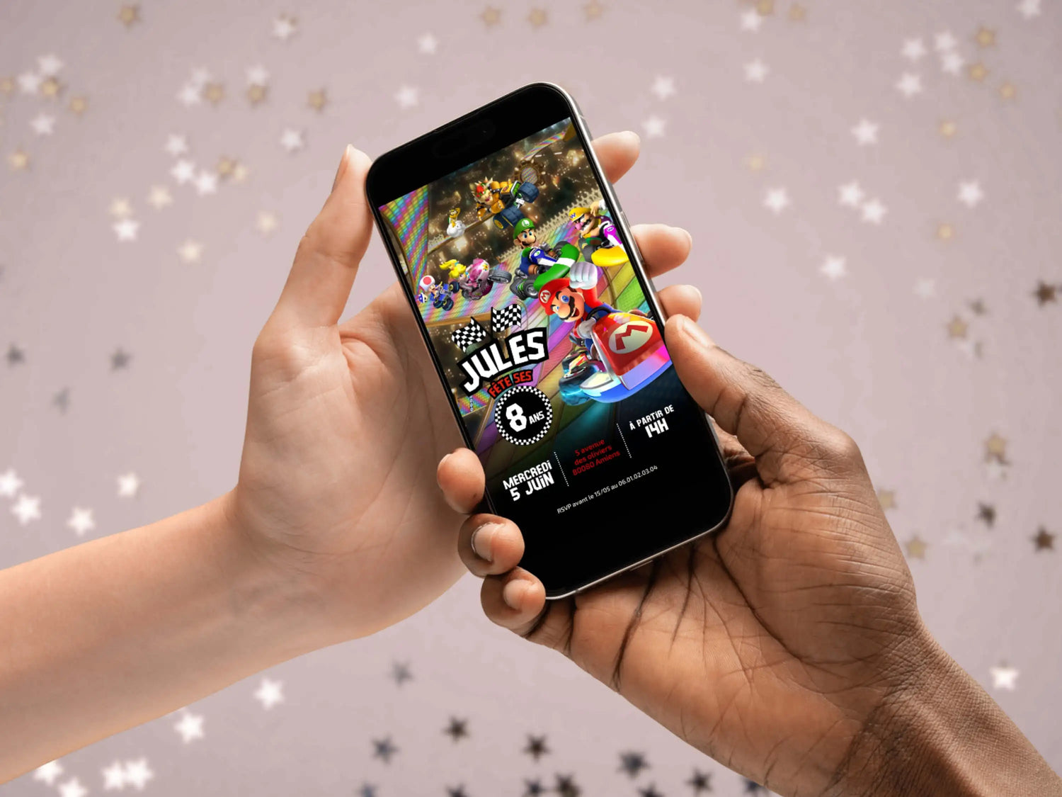Sorgen Sie vom ersten Moment an für Aufsehen, indem Sie uns mit unserer personalisierten digitalen MARIO KART-Geburtstagseinladung einladen, die Sie per Nachricht, WhatsApp oder E-Mail versenden können . Dieses praktische, schnelle und 100 % digitale Format ist ideal für eine stressfreie Party. Personalisieren Sie Ihre mobile Einladung ganz einfach online über Canva : Vorname, Alter, Datum, Ort … alles lässt sich mit wenigen Klicks ändern, ohne Software. Nach der Validierung kann Ihre digitale Einladung heruntergeladen und an Ihre Gäste gesendet werden. Diese individuell gestaltete, hochwertige Karte ist für den Kindergeburtstag konzipiert und ermöglicht eine stilvolle Einladung ohne Druck und ist sofort verfügbar .