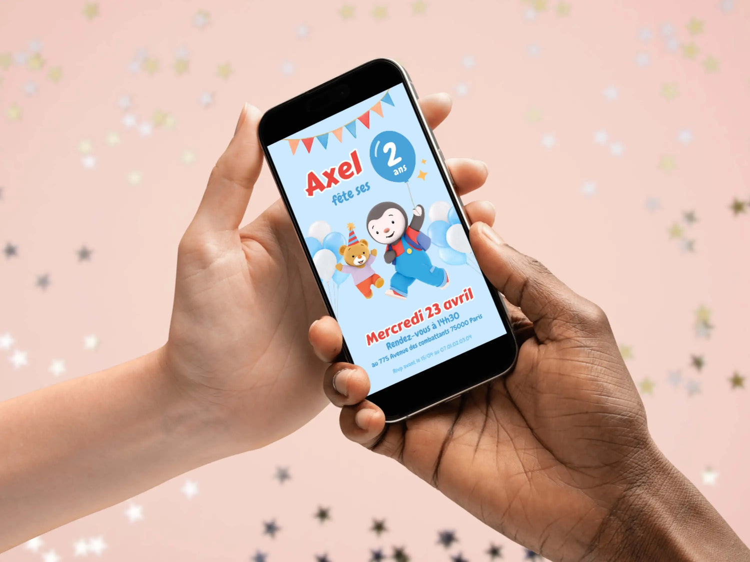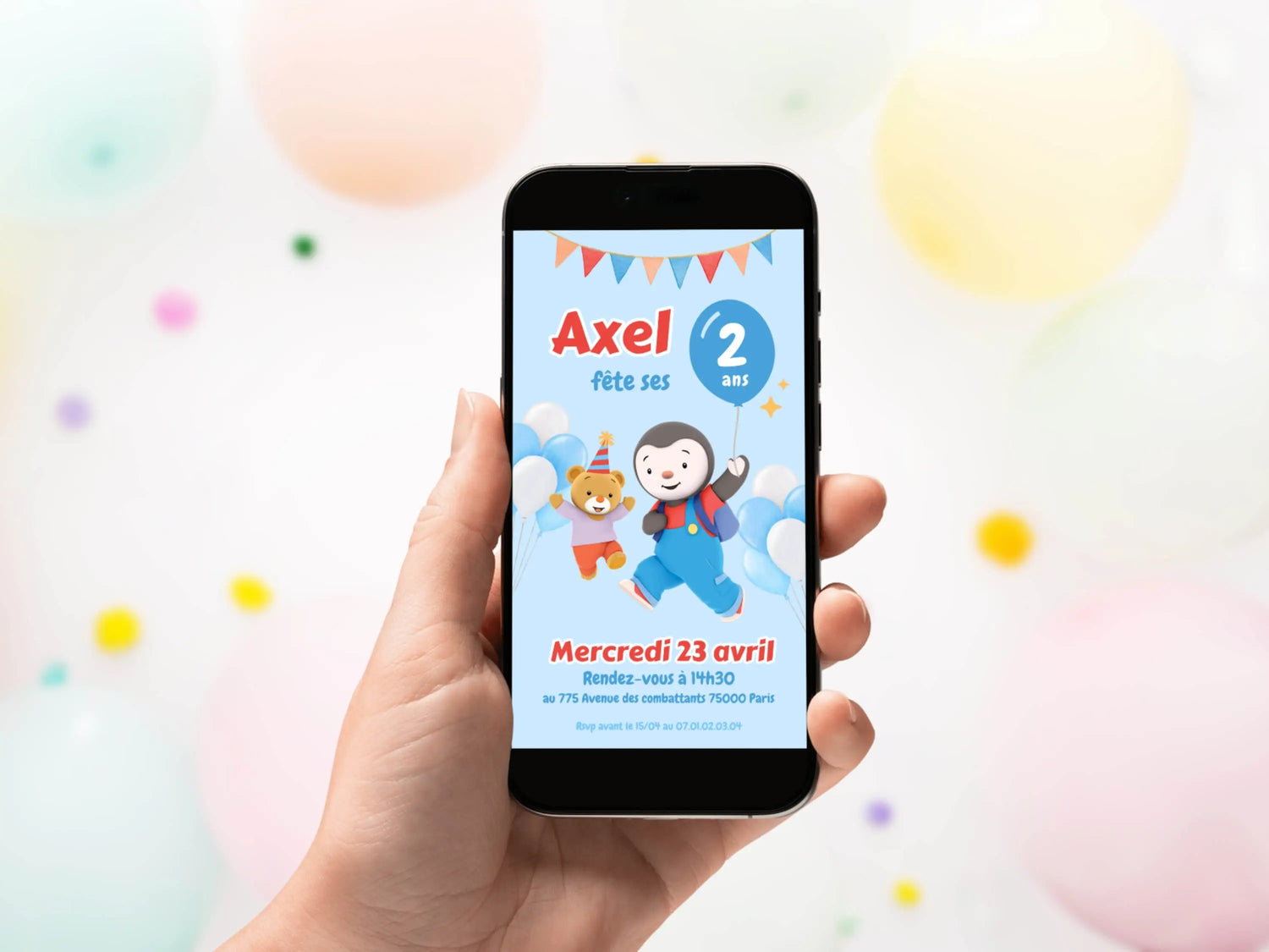 Sorgen Sie vom ersten Moment an für Aufsehen mit unserer personalisierten digitalen Geburtstagseinladung von TCHOUPI, die Sie per SMS, WhatsApp oder E-Mail versenden können . Dieses praktische, schnelle und 100 % digitale Format ist ideal für eine stressfreie Party. Gestalten Sie Ihre mobile Einladung ganz einfach online über Canva : Vorname, Alter, Datum, Ort … alles lässt sich mit wenigen Klicks und ohne Software ändern. Nach der Validierung steht Ihre digitale Einladung zum Download bereit und kann an Ihre Gäste verschickt werden. Diese einzigartig gestaltete, hochwertige Karte wurde speziell für Kindergeburtstage entwickelt und ermöglicht Ihnen eine stilvolle Einladung ohne Ausdrucken und ist sofort verfügbar .