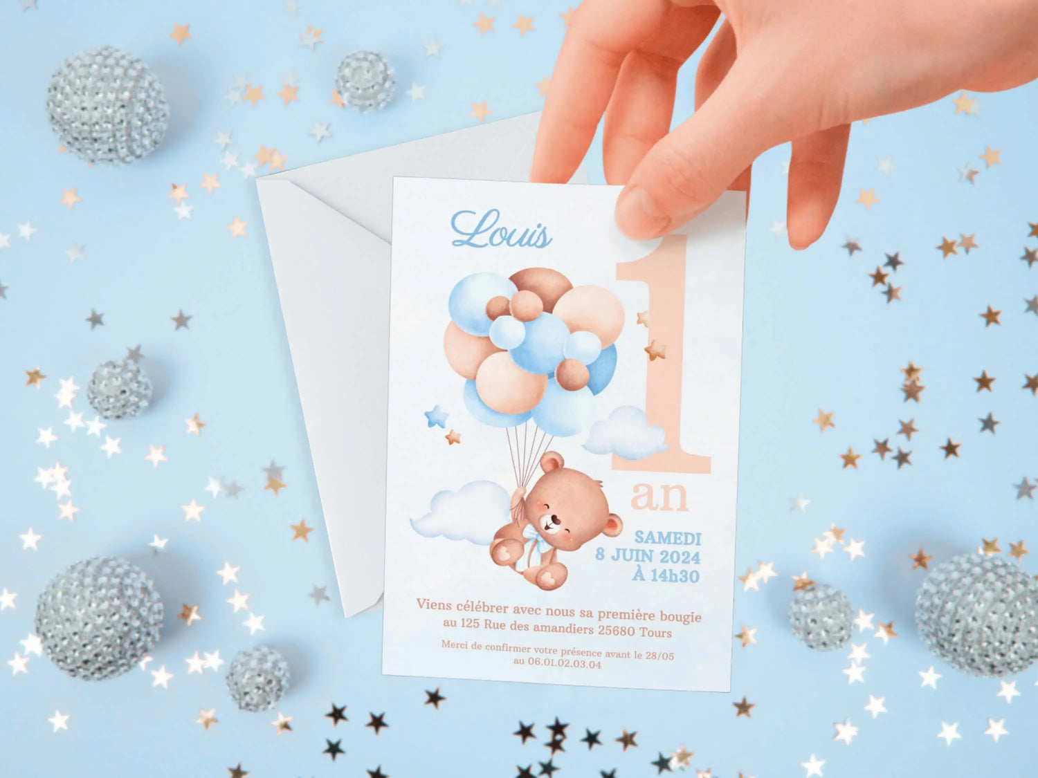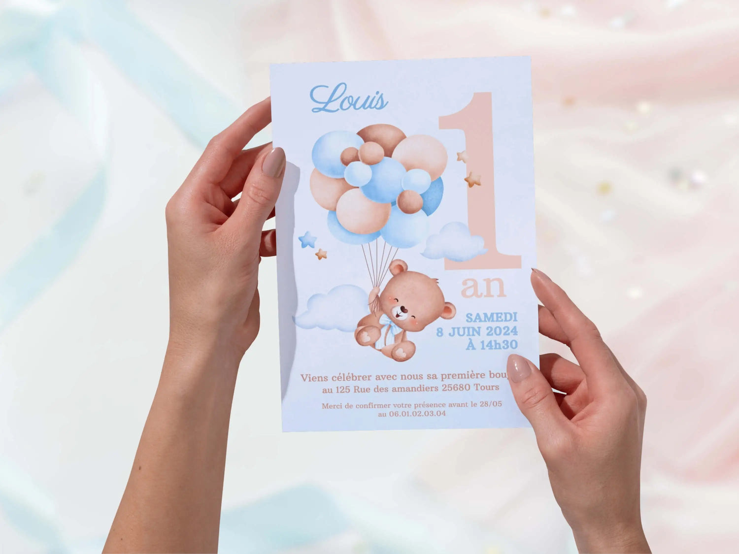 Dank unseres einfachen und intuitiven Personalisierungstools können Sie den Text mit nur wenigen Klicks anpassen: Vorname, Alter, Datum, Ort … alles ist editierbar, sodass es perfekt zu Ihrem Baby und dem Thema seiner Party passt. Was für eine Freude für Sie, Ihren Lieben eine personalisierte Einladung zukommen zu lassen, die den Beginn dieses wunderschönen Festtages zu seinem ersten Geburtstag markiert.