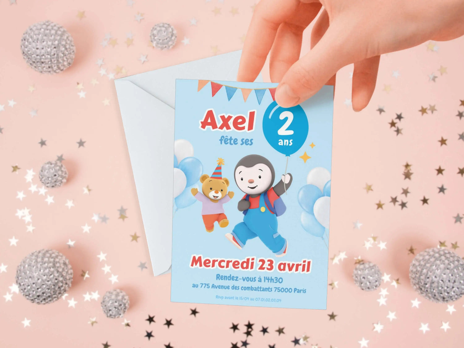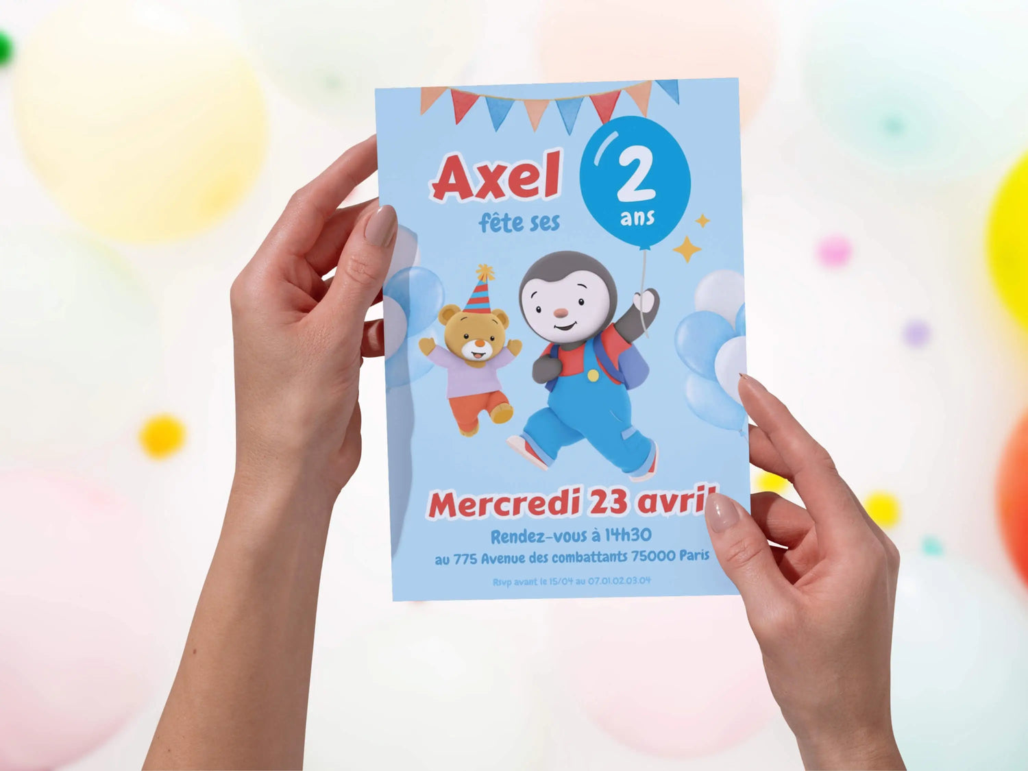 Mit unserem einfachen und intuitiven Anpassungstool können Sie jedes Detail des Textes anpassen, damit er Ihre Feier perfekt widerspiegelt. Vorname, Alter, Datum, Ort … alles ist anpassbar. Sie erstellen eine Karte, die perfekt zum Thema ihrer Party passt und die sie stolz zeigen werden. Dieser kleine Moment, wenn Ihr Kind „seine“ Einladung überreicht … das ist bereits eine Erinnerung für sich.