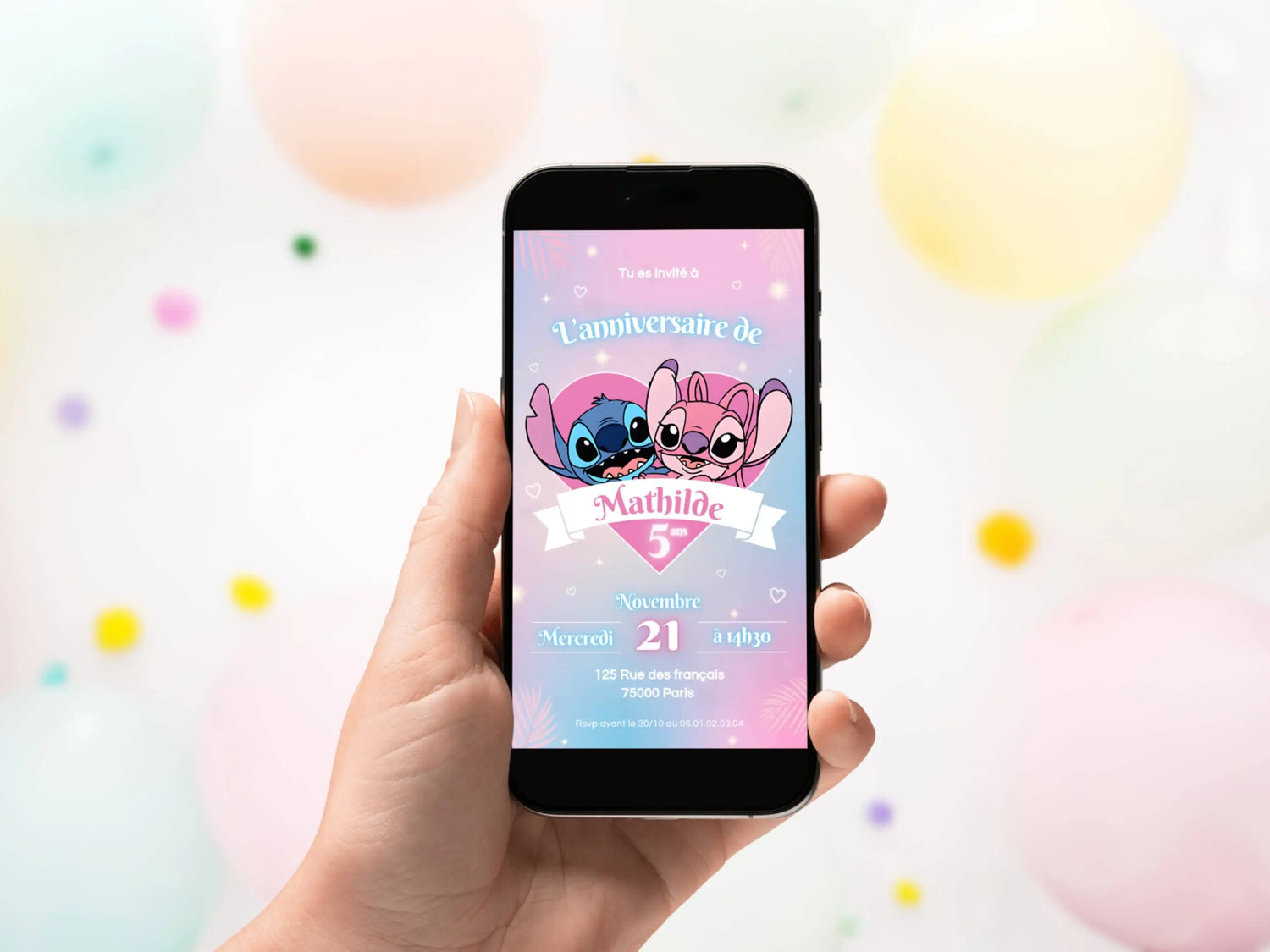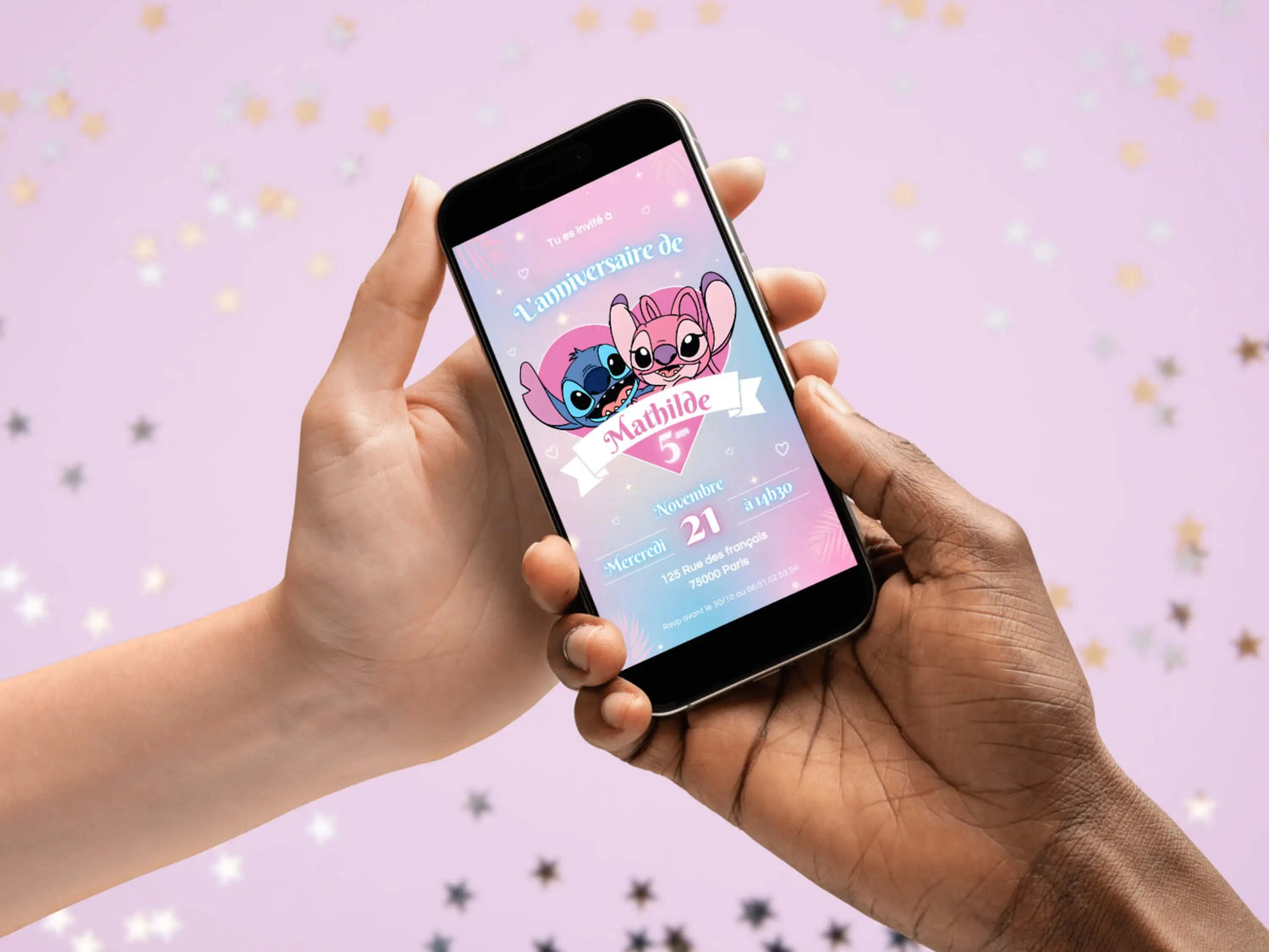 Invite your guests in style with our personalized STITCH & ANGEL mobile invitation. Perfect for children's birthdays , this digital invitation can be sent directly by message . Easily customize it on CANVA and impress your guests with a unique and quality design .