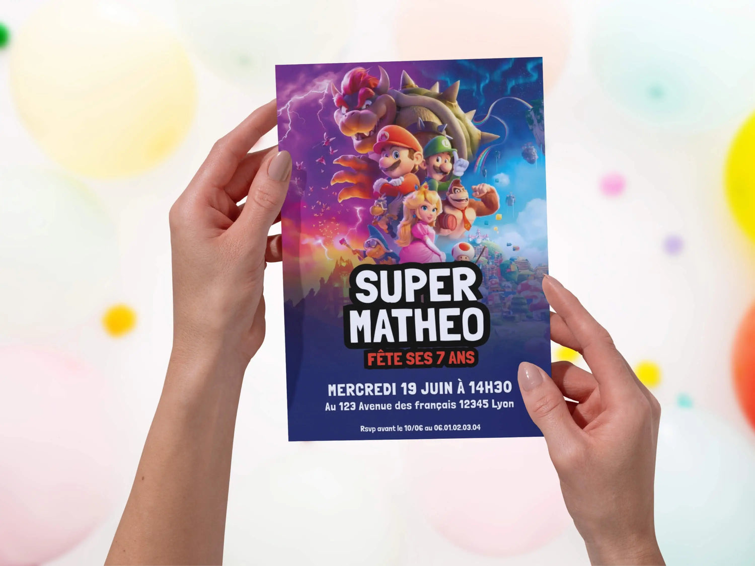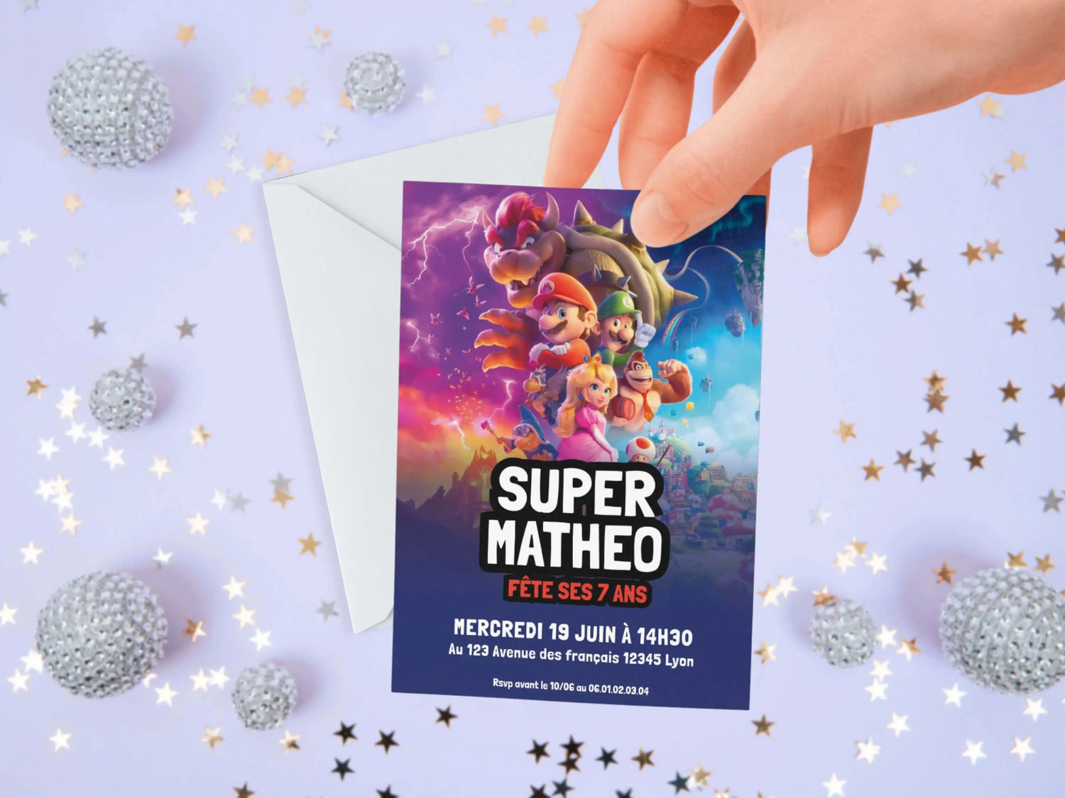 Make your child's birthday a unique event with our personalized SUPER MARIO invitations. Printed in 10 copies on quality paper , they feature a custom design with or without an envelope. Easy to customize with our online tool, for unique and memorable invitations.
