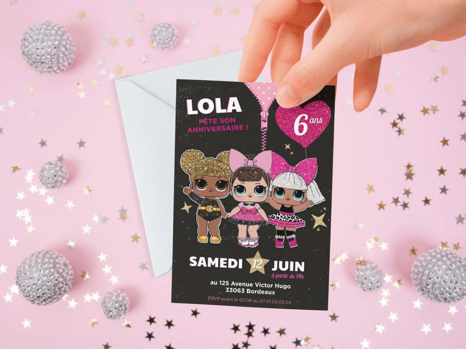 Faites de son anniversaire un moment magique avec nos invitations personnalisées POUPÉE LOL. Chaque lot de 10 cartes bénéficie d’une impression professionnelle sur papier épais 350 g/m², avec ou sans enveloppes blanches.