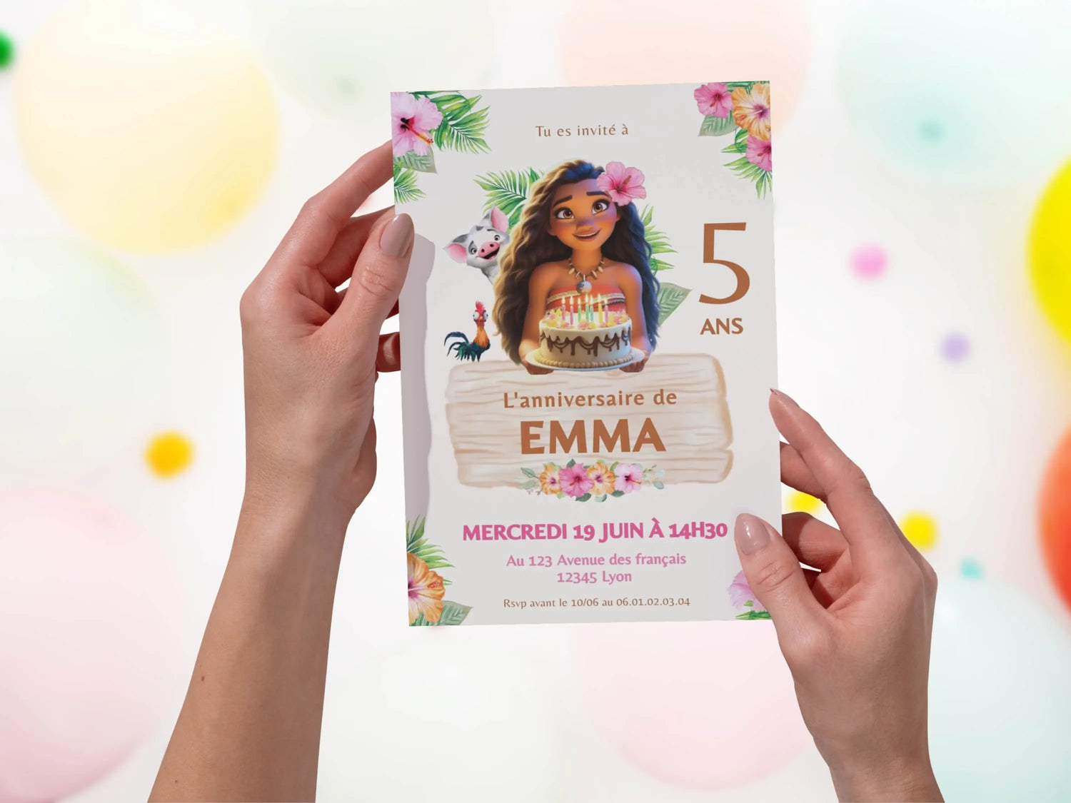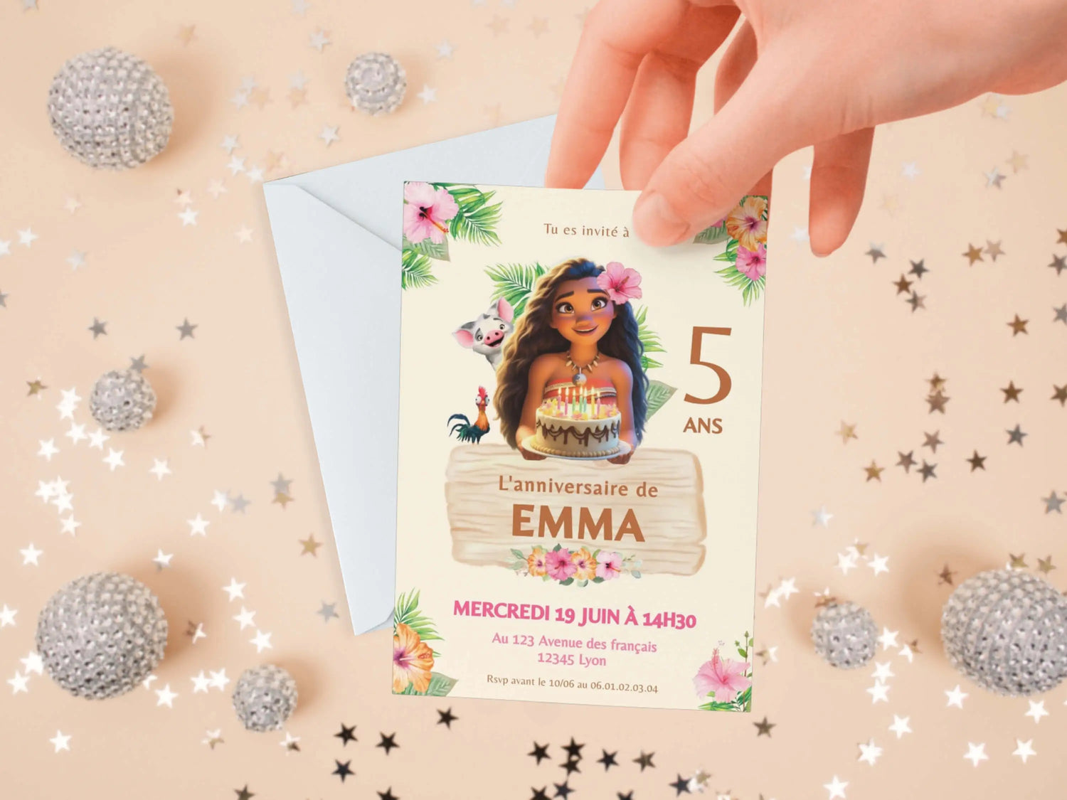 Make your child's birthday a unique event with our personalized VAIANA invitations. Printed in 10 copies on quality paper , they feature a custom design with or without an envelope. Easy to personalize with our online tool, for unique and memorable invitations.