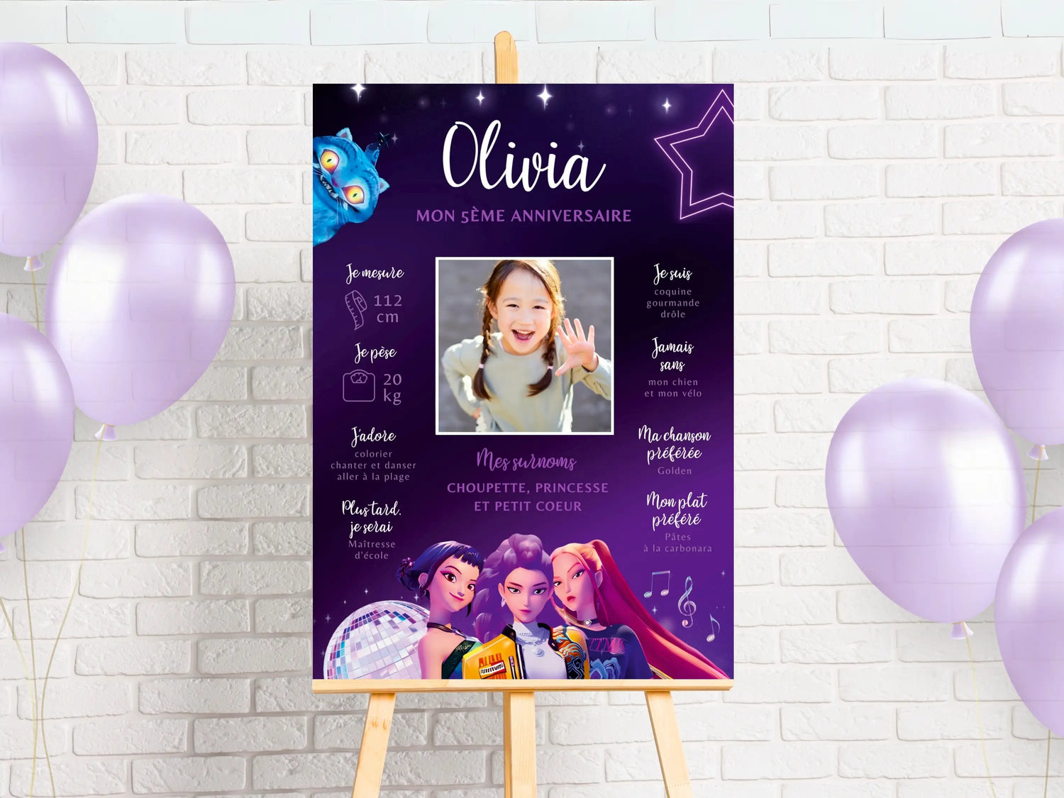 Sublimez la décoration d’anniversaire de votre enfant avec cette affiche anniversaire personnalisée KPOP DEMON HUNTERS ! Facile à personnaliser via notre outil en ligne avec sa photo, son prénom et ses petits détails qui le rende unique. Cette affiche décorative bénéficie d’une impression professionnelle sur papier semi-brillant 200g/m², pour un rendu éclatant et durable. Un souvenir plein d’émotion, à assortir avec nos autres papeteries personnalisées pour une décoration d’anniversaire harmonieuse et mémorable autour d'un même thème.
