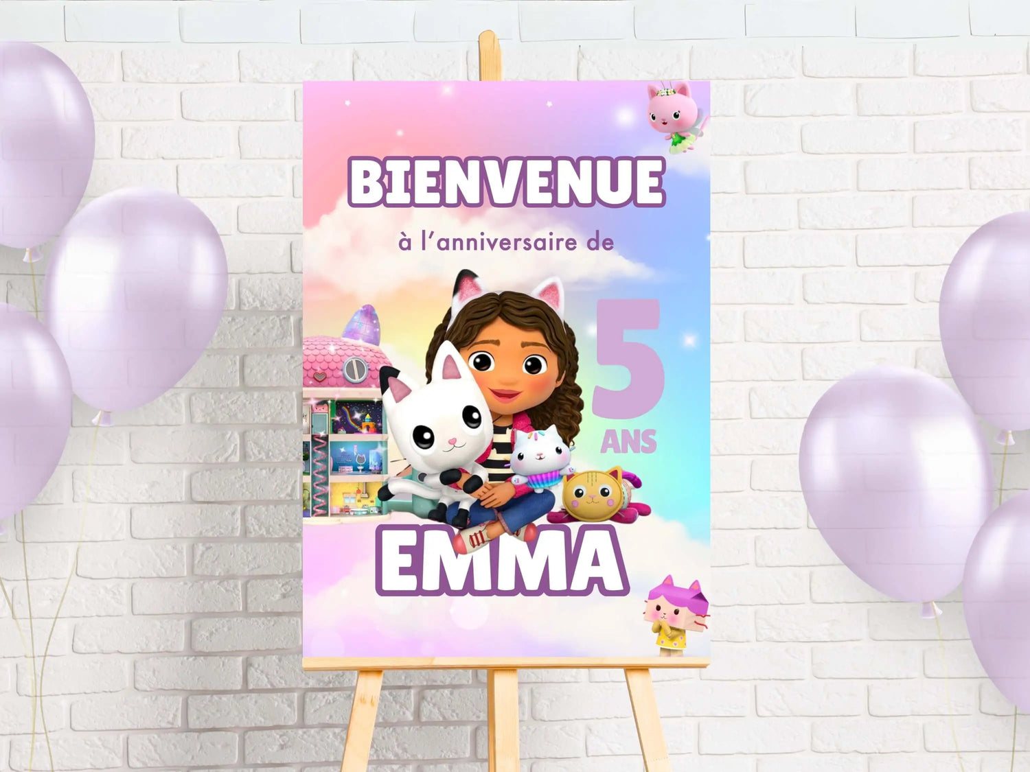 Accueillez vos invités avec une affiche de bienvenue personnalisée GABBY ET LA MAISON MAGIQUE qui donne le ton dès l’entrée ! Ce panneau de bienvenue d’anniversaire est idéal pour compléter votre décoration d’anniversaire enfant. Facile à personnaliser en ligne (prénom, âge, date…), il bénéficie d’une impression professionnelle sur papier semi-brillant 200 g/m², en format A4, A3, 50x70 cm ou A1. Cette affiche de bienvenue au design de qualité peut être posée sur un chevalet, accrochée au mur ou conservée en souvenir dans la chambre. Un panneau de bienvenue personnalisé qui allie style, qualité et émotion !