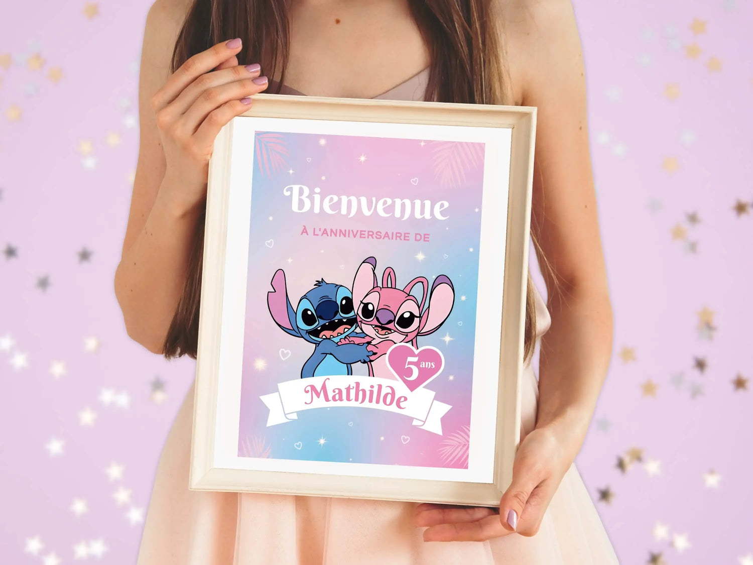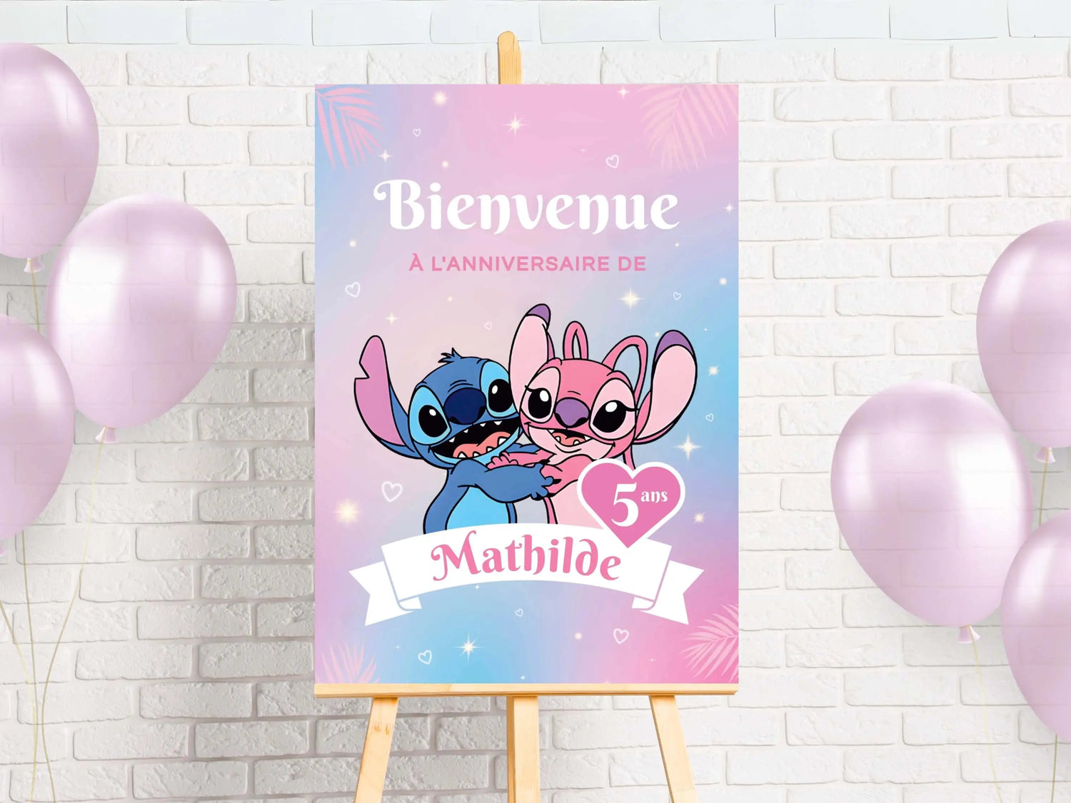 Accueillez vos invités avec une affiche de bienvenue personnalisée STITCH & ANGEL qui donne le ton dès l’entrée ! Ce panneau de bienvenue d’anniversaire est idéal pour compléter votre décoration d’anniversaire enfant. Facile à personnaliser en ligne (prénom, âge, date…), il bénéficie d’une impression professionnelle sur papier semi-brillant 200 g/m², en format A4, A3, 50x70 cm ou A1. Cette affiche de bienvenue au design de qualité peut être posée sur un chevalet, accrochée au mur ou conservée en souvenir dans la chambre. Un panneau de bienvenue personnalisé qui allie style, qualité et émotion !