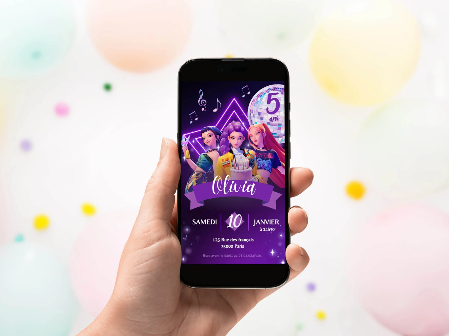 Faites sensation dès l’invitation avec notre invitation d’anniversaire digitale personnalisée KPOP DEMON HUNTERS, à envoyer par message, WhatsApp ou email. Ce format numérique pratique, rapide et 100 % digital est idéal pour une fête sans stress. Personnalisez facilement votre invitation mobile en ligne via Canva : prénom, âge, date, lieu… tout se modifie en quelques clics, sans logiciel. Une fois validée, votre invitation numérique est prête à être téléchargée et envoyée à vos invités. Pensée pour un anniversaire enfant, cette carte au design unique et de qualité permet d’inviter avec style, sans impression, et est disponible immédiatement.