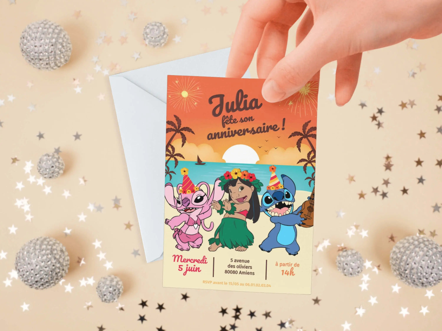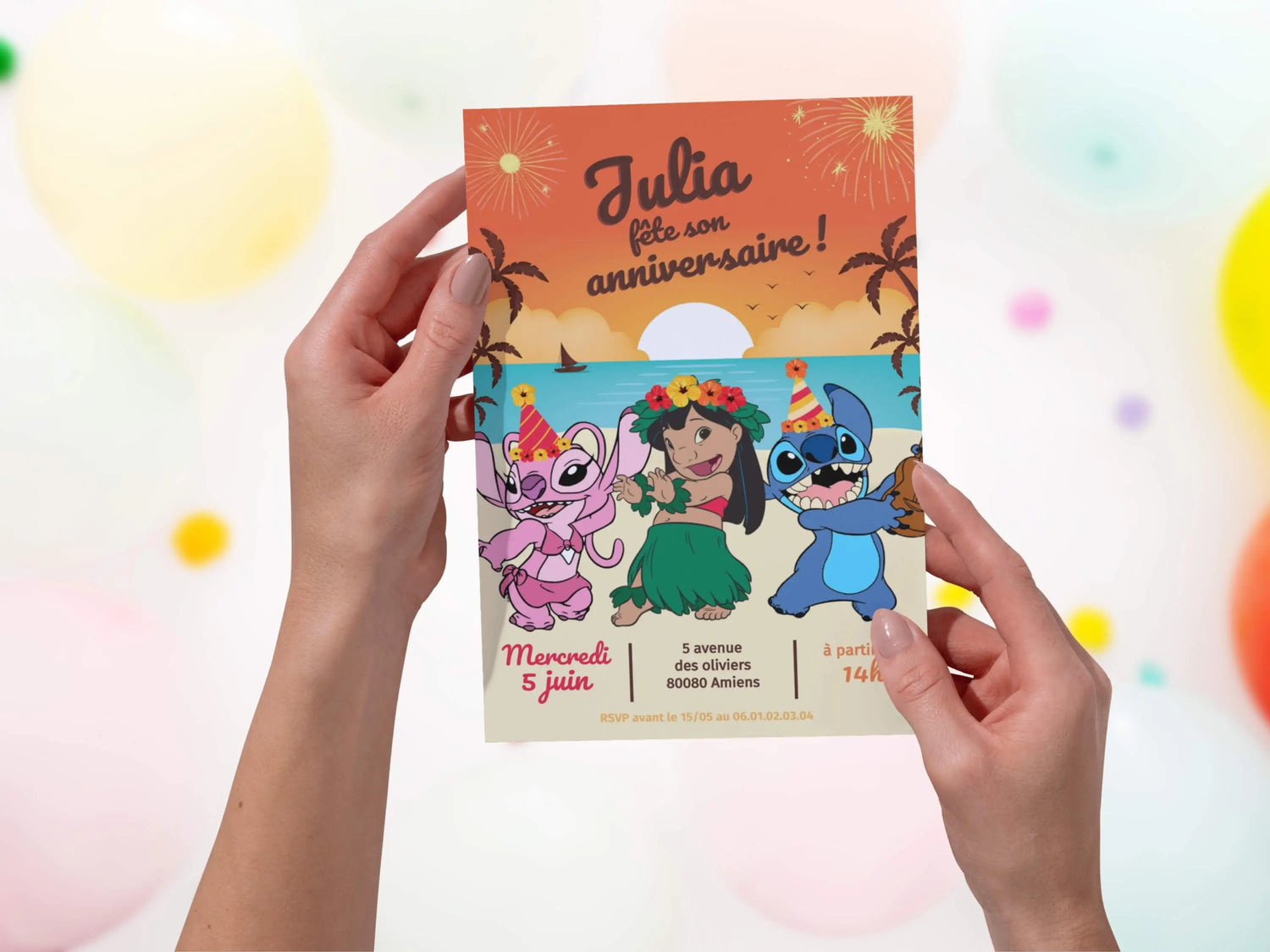 Faites de son anniversaire un moment magique avec nos invitations personnalisées LILO, STITCH et ANGEL. Chaque lot de 10 cartes bénéficie d’une impression professionnelle sur papier épais 350 g/m², avec ou sans enveloppes blanches.